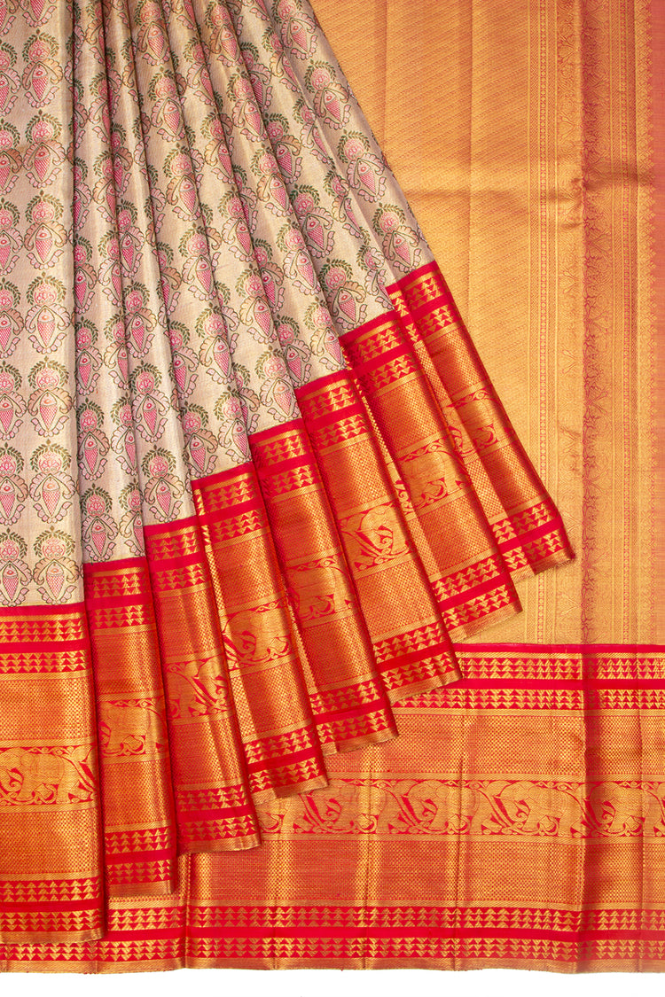 Exude the aura of royalty in this Kanchipuram Silk Tissue Brocade Gold Saree The rich gold tissue base is embellished with gold zari floral brocade tucked into a big red border flaunting a majestic elephant procession at odds with the brocade series and enriched with a pink tissue pallu prettified with a diagonal line series, exuding an exemplary and fascinating vibe A pink tissue-brocade zari-bordered blouse is included with the saree