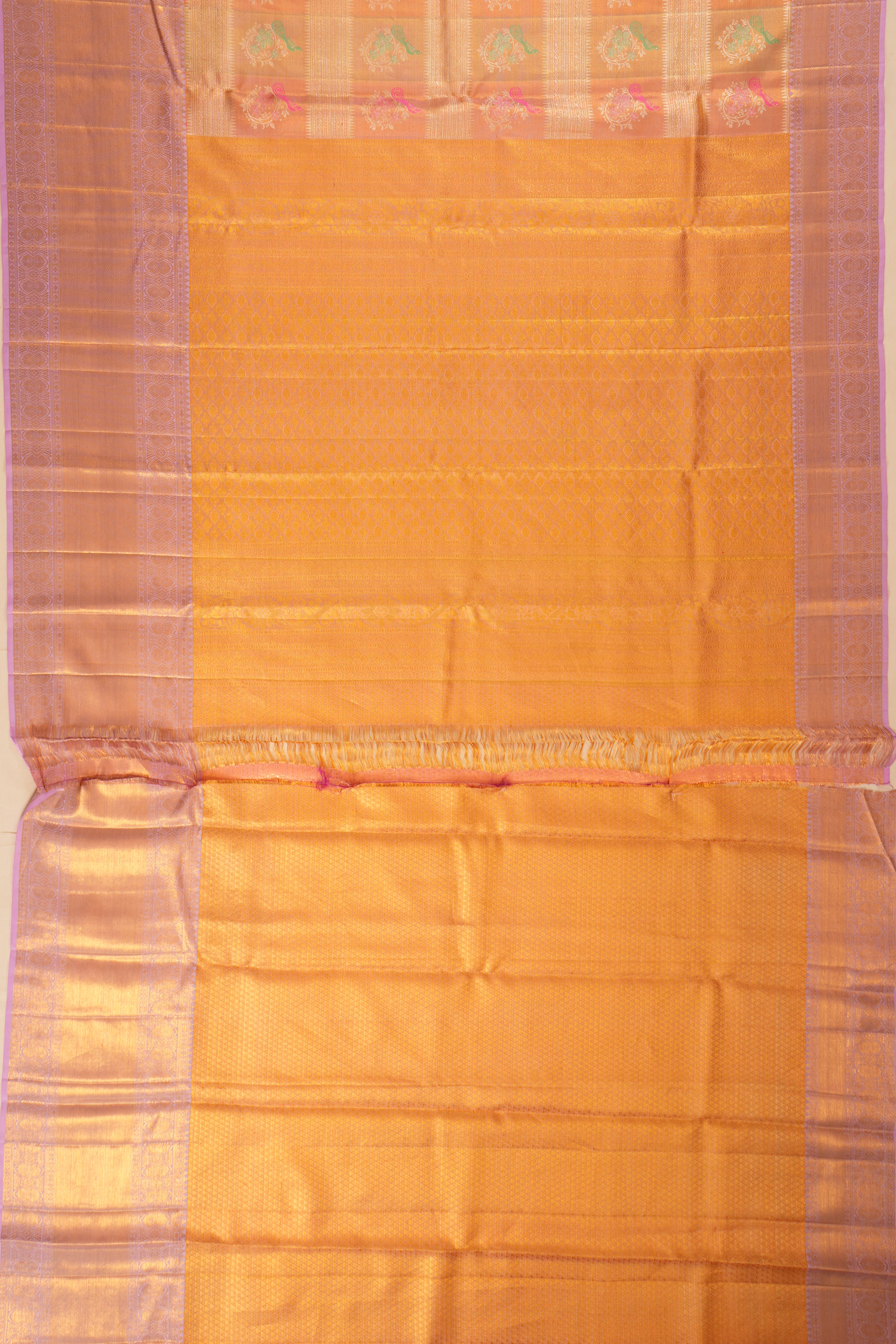 A radiant gold zari tissue base is brought to life with floral brocade and vivid meenakari peacock motifs — a magnificent display of colour and craftsmanship.