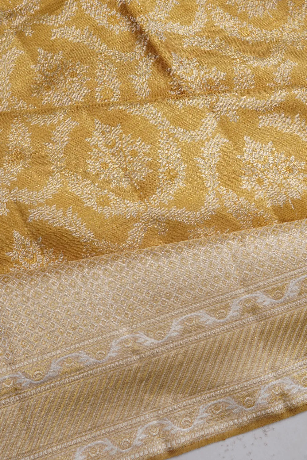 The body of the saree is a symphony of gold zari tissue, intricately woven with silver zari floral brocade, casting an enchanting glow of traditional artistry