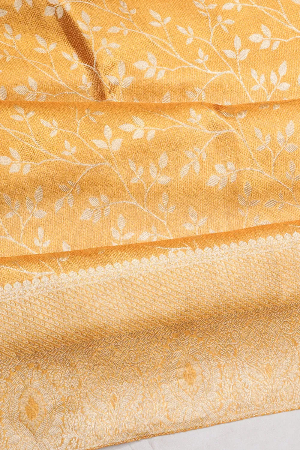 The saree features a self-border embellished with delicate silver zari floral creeper brocade and a subtle leaf butta, adding finesse to its elegant design