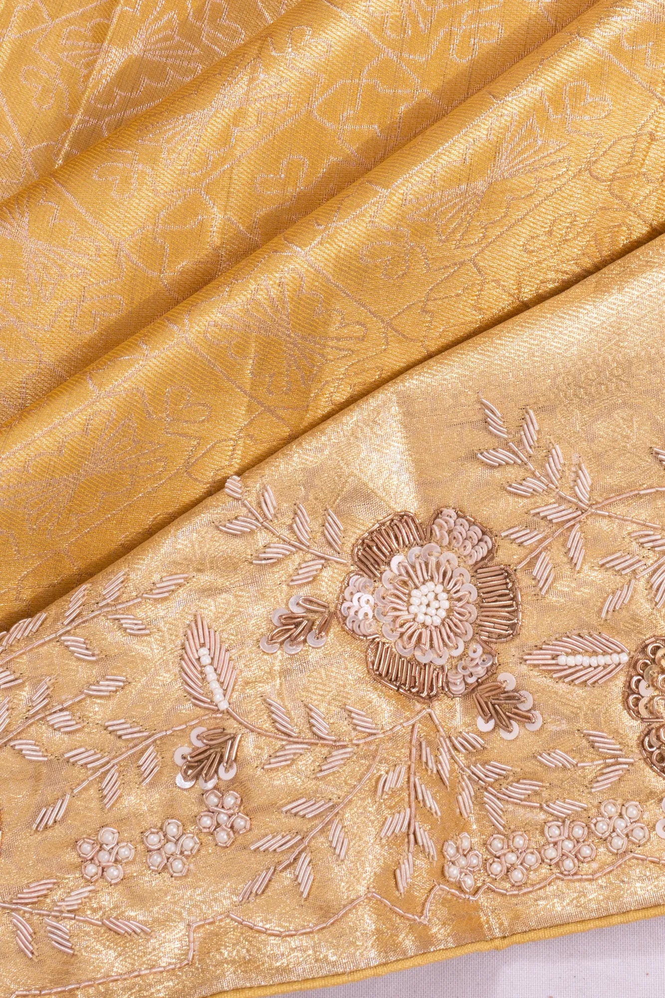 Rich gold zari tissue base adorned with intricate floral brocade, this body exudes grace with a radiant texture and time-honoured detailing.