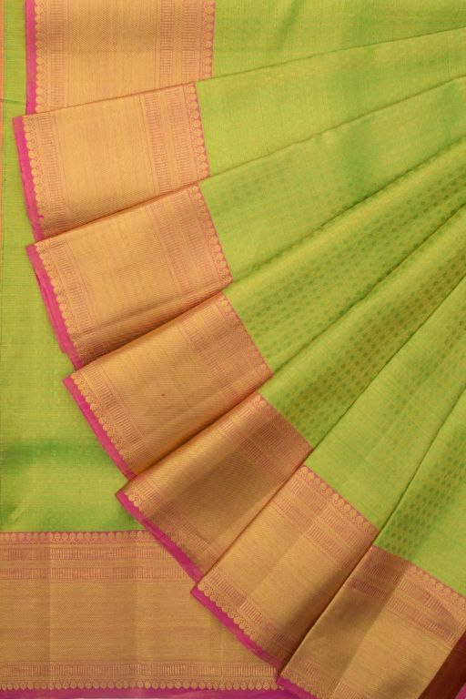 The drape is delivered in gold zari floral brocade over a green tissue foundation, with a pink border featuring diagonal line series and accentuated with a pallu featuring gold zari brocade convoyed with kaddi, lending the drape a mesmerising elegance for your perfect occasion The ensemble is paired up with a pink tissue brocade zari bordered blouse