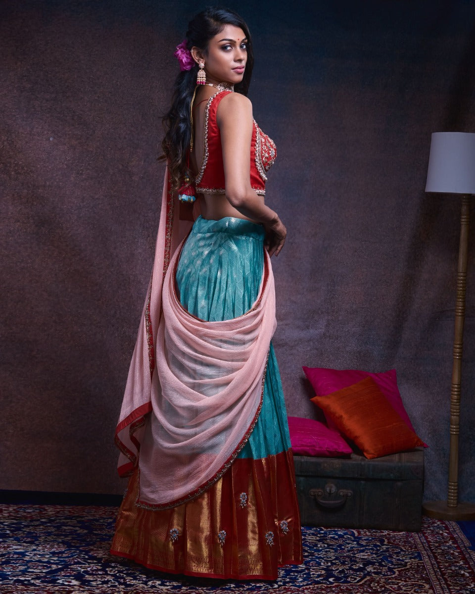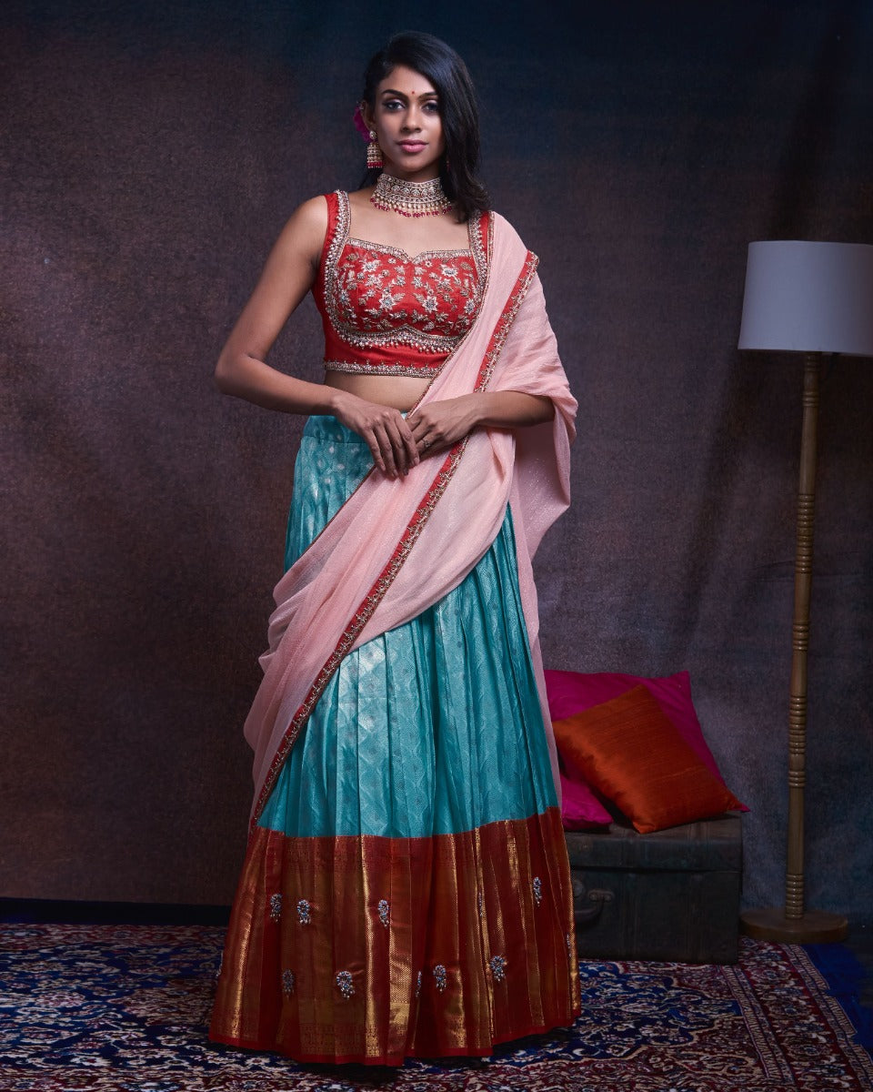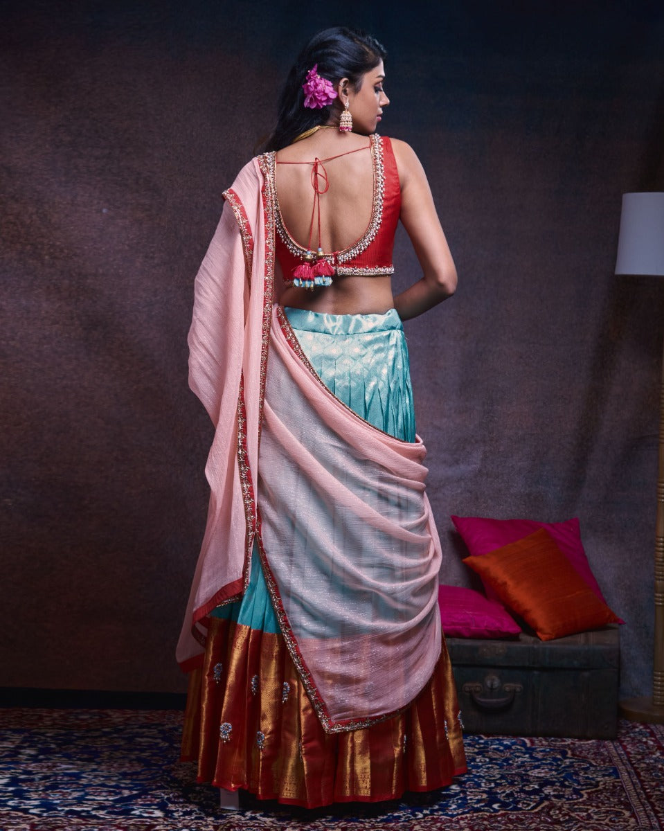 Kanchipuram Silk Tissue Brocade Sky Blue Lehenga With Tussar Fusion