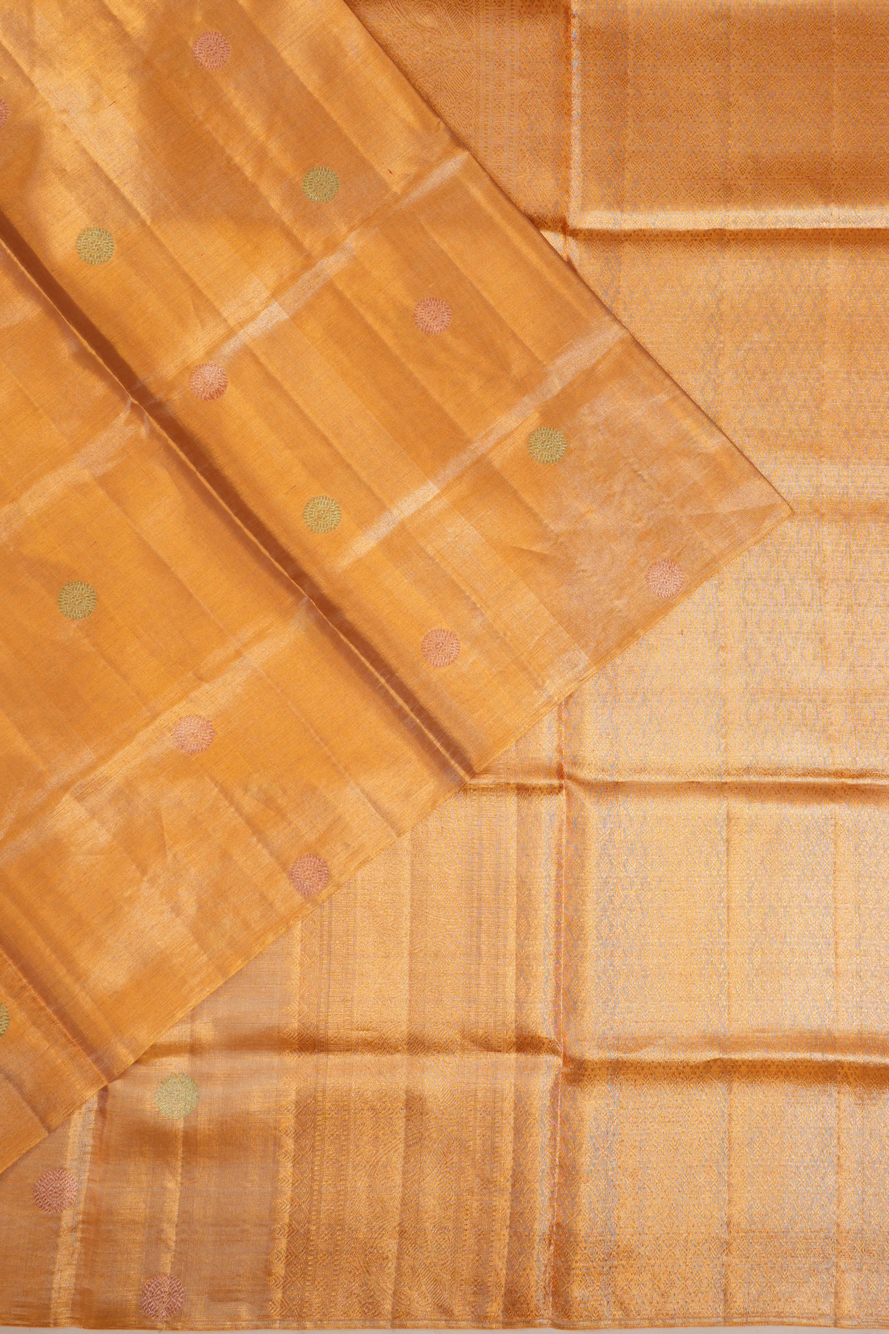 Crafted in luminous gold zari tissue, this saree is delicately dotted with floral buttas, offering a graceful and understated luxury.