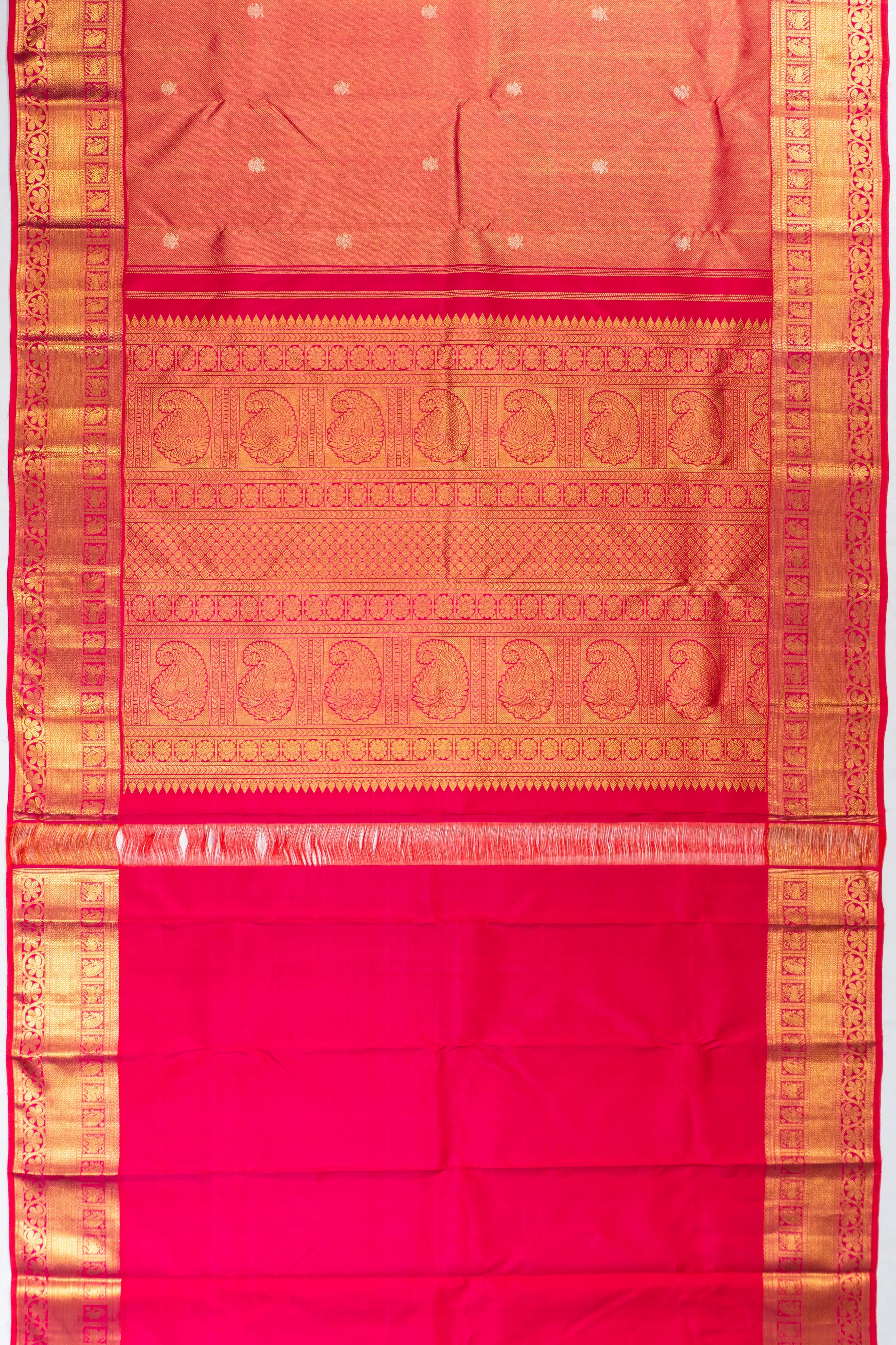 The pallu, similarly enhanced with self gold zari brocade, showcases a captivating array of floral paisleys, adding layers of beauty to this luxurious piece