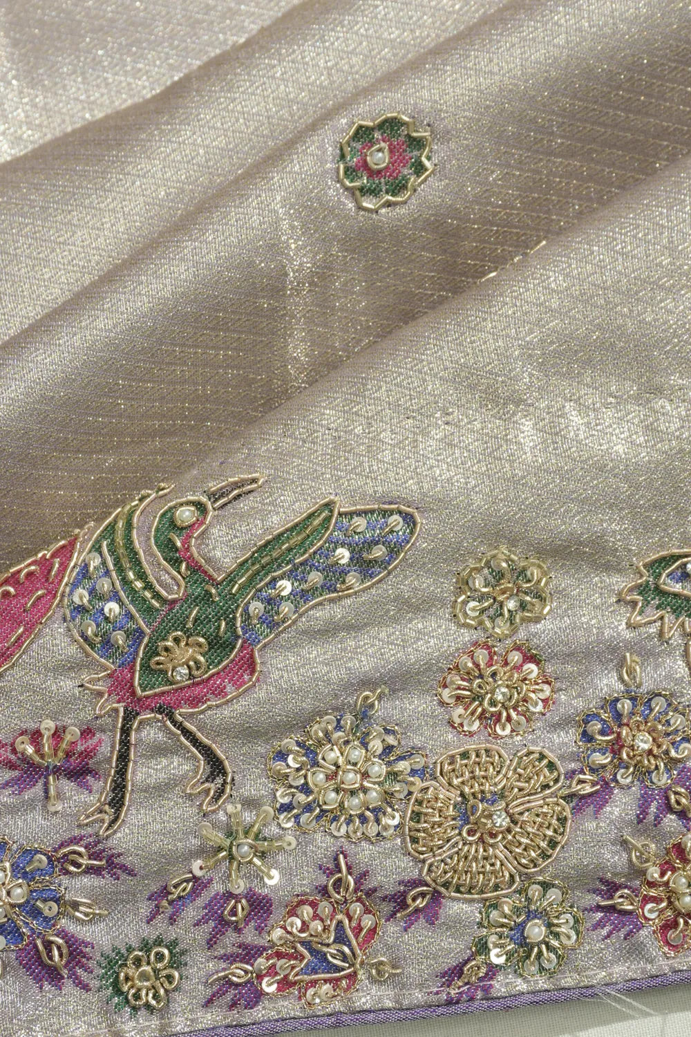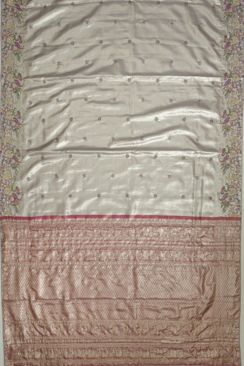 Made from silver zari tissue, the saree features delicately woven floral buttas that add subtle charm and timeless texture to the soft grey base.