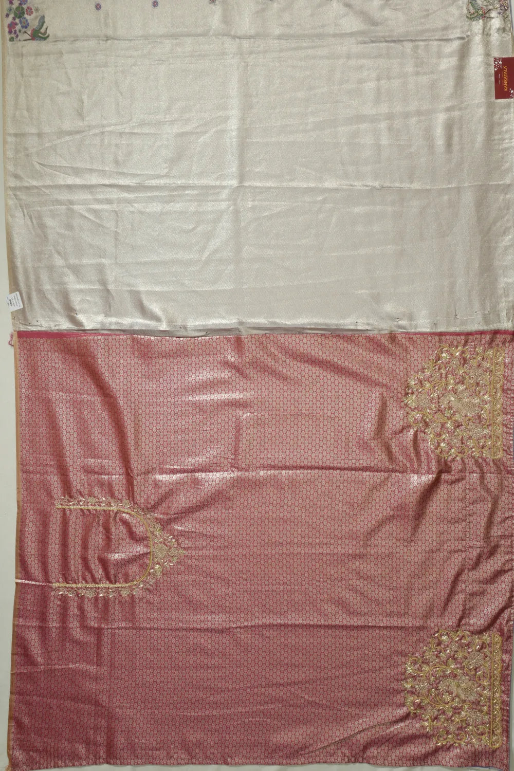 Designed in contrasting pink, the silver zari floral brocade pallu is adorned with elegant peacock motifs, symbolizing grace and prosperity, making it a true highlight of the ensemble.