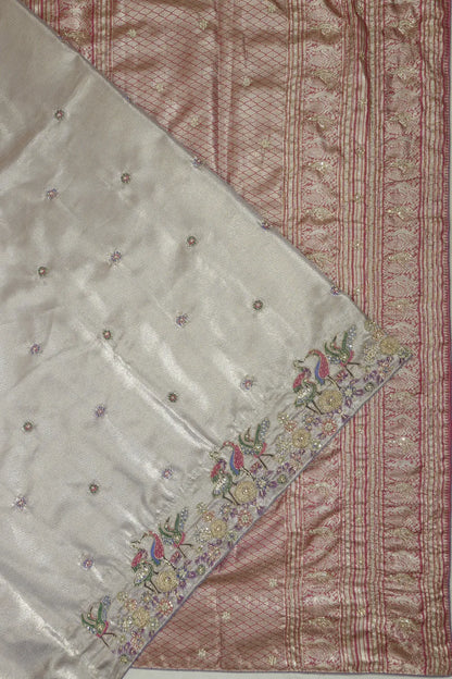 Kanchipuram Silk Tissue Butta Silver Saree With Zardosi Work