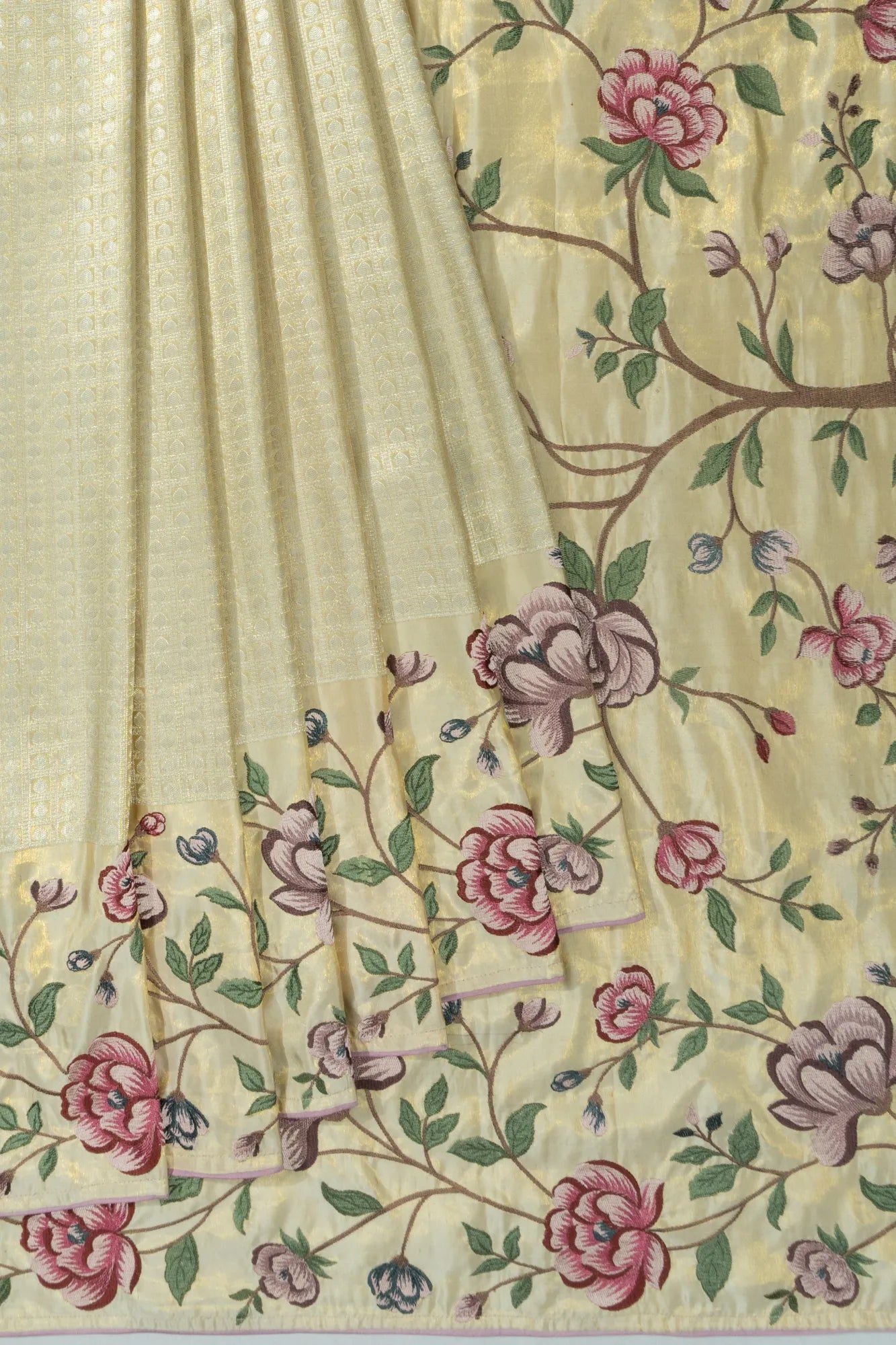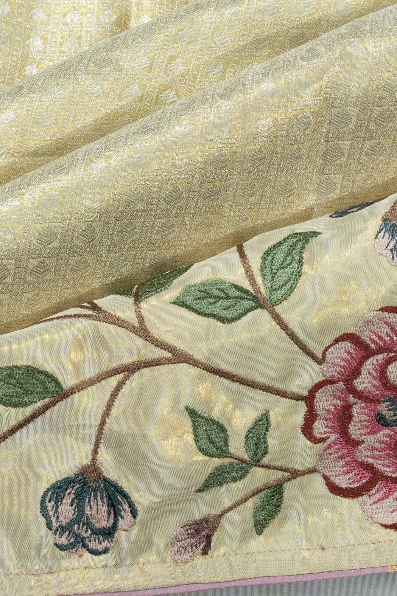 The saree boasts a majestic self-gold zari tissue border, enriched with intricate floral embroidery and a charming pink edge, adding a touch of sophistication