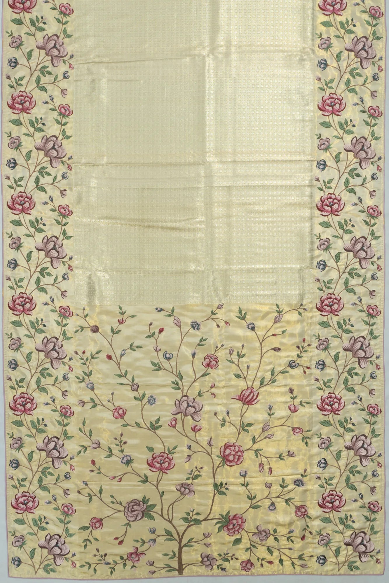 Kanchipuram Silk Tissue Checks And Butta Gold Saree With Embroidery Border