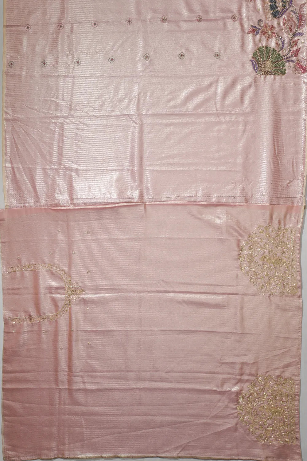 Kanchipuram Silk Tissue Diagonal Lines Pink Saree With Zardosi Work