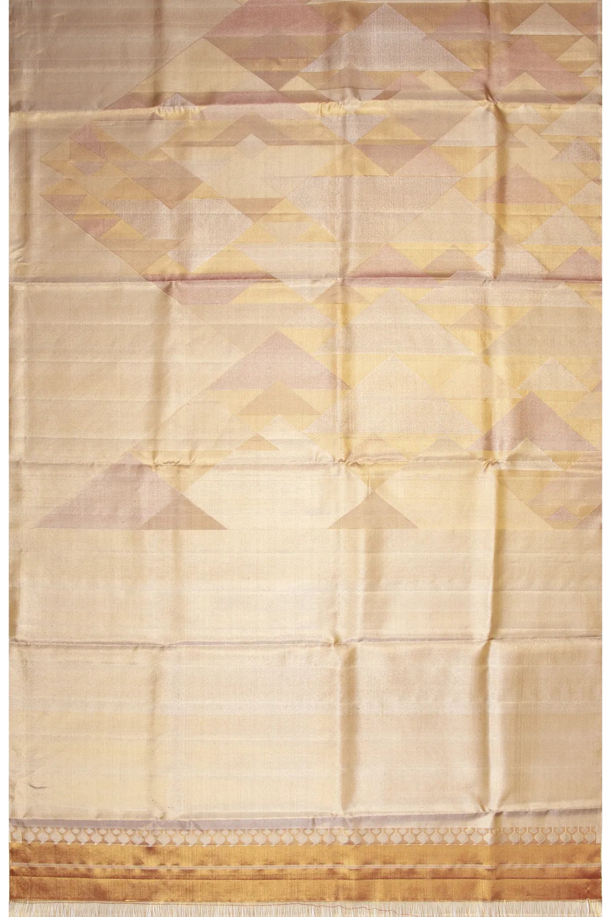 Woven with gold zari tissue and geometrical brocade, the saree exudes a soft yet radiant glow, making it an exquisite choice for special occasions.