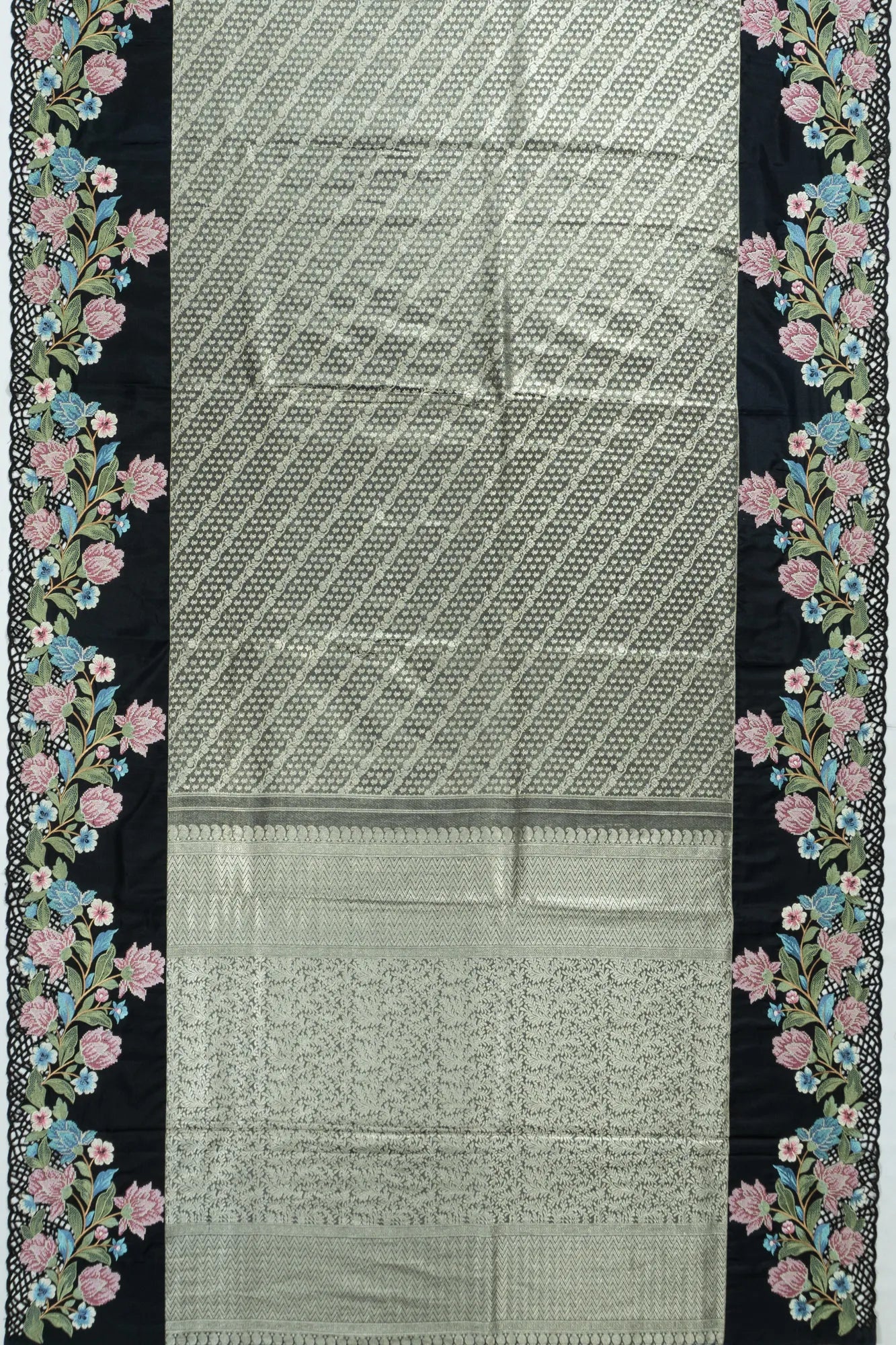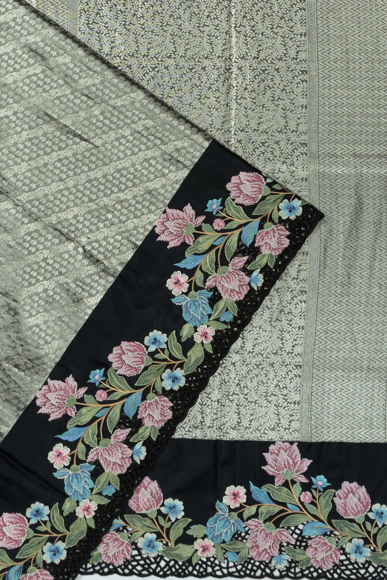 The body showcases a luxurious silver zari tissue, adorned with a delicate floral brocade, creating a shimmering canvas of timeless beauty