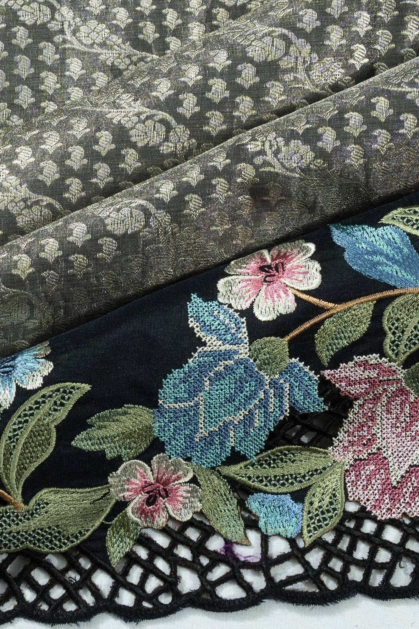 The saree features a striking contrast with its multicolour floral embroidery border, adding a vibrant touch of elegance