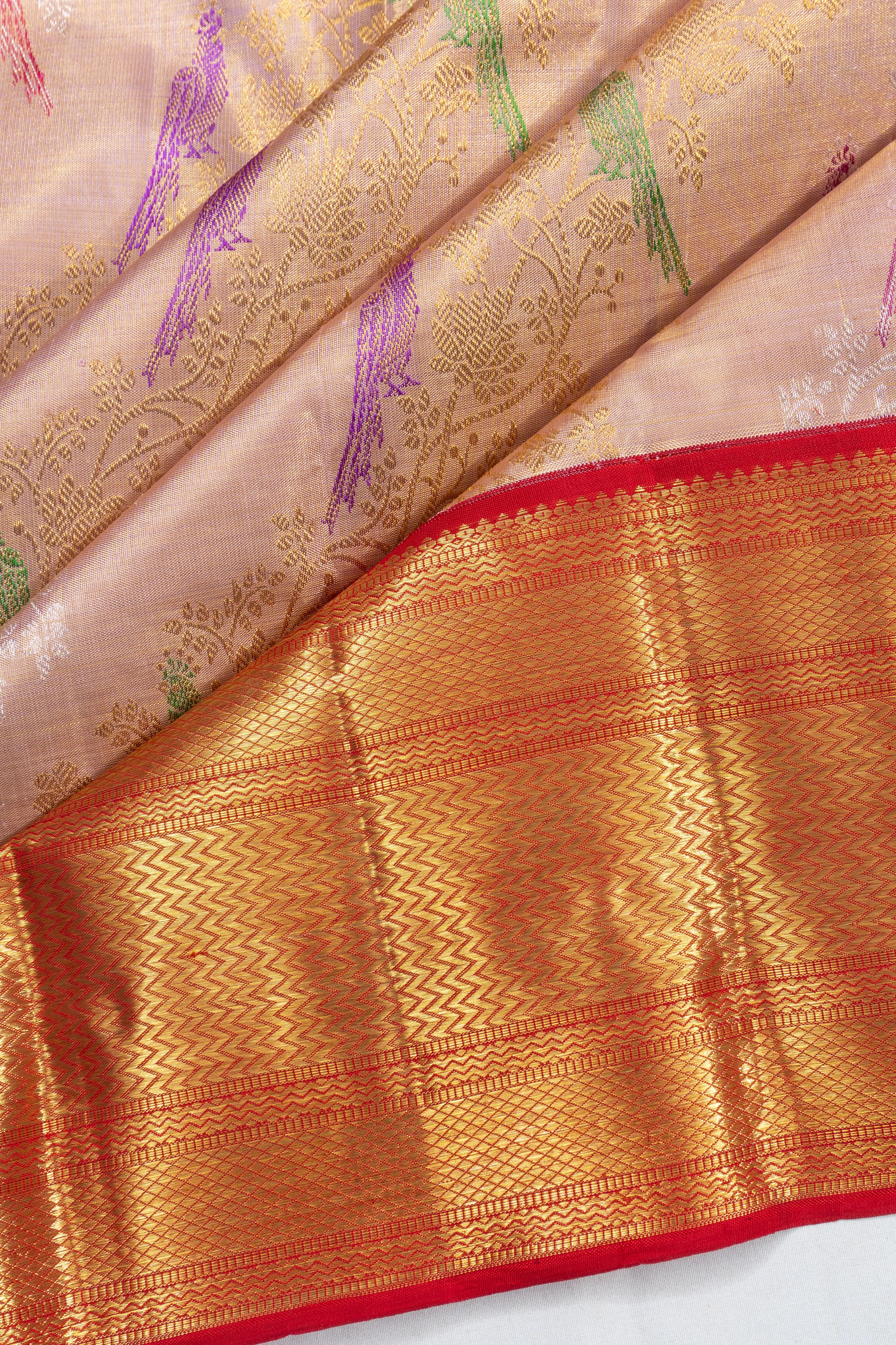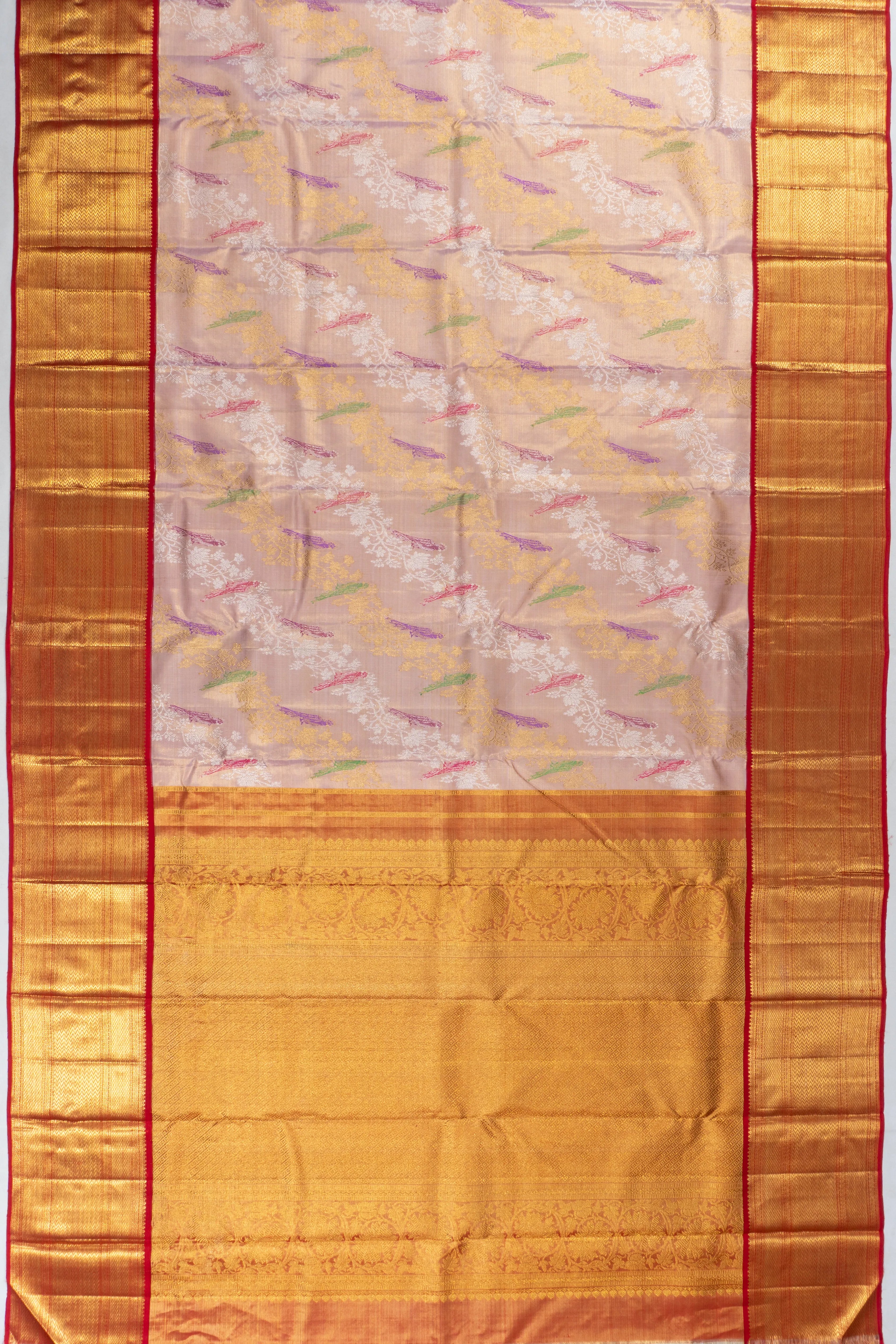 The body showcases a harmonious blend of gold and silver zari floral leheriya jaal, adorned with vibrant bird motifs that add a splash of color and whimsy