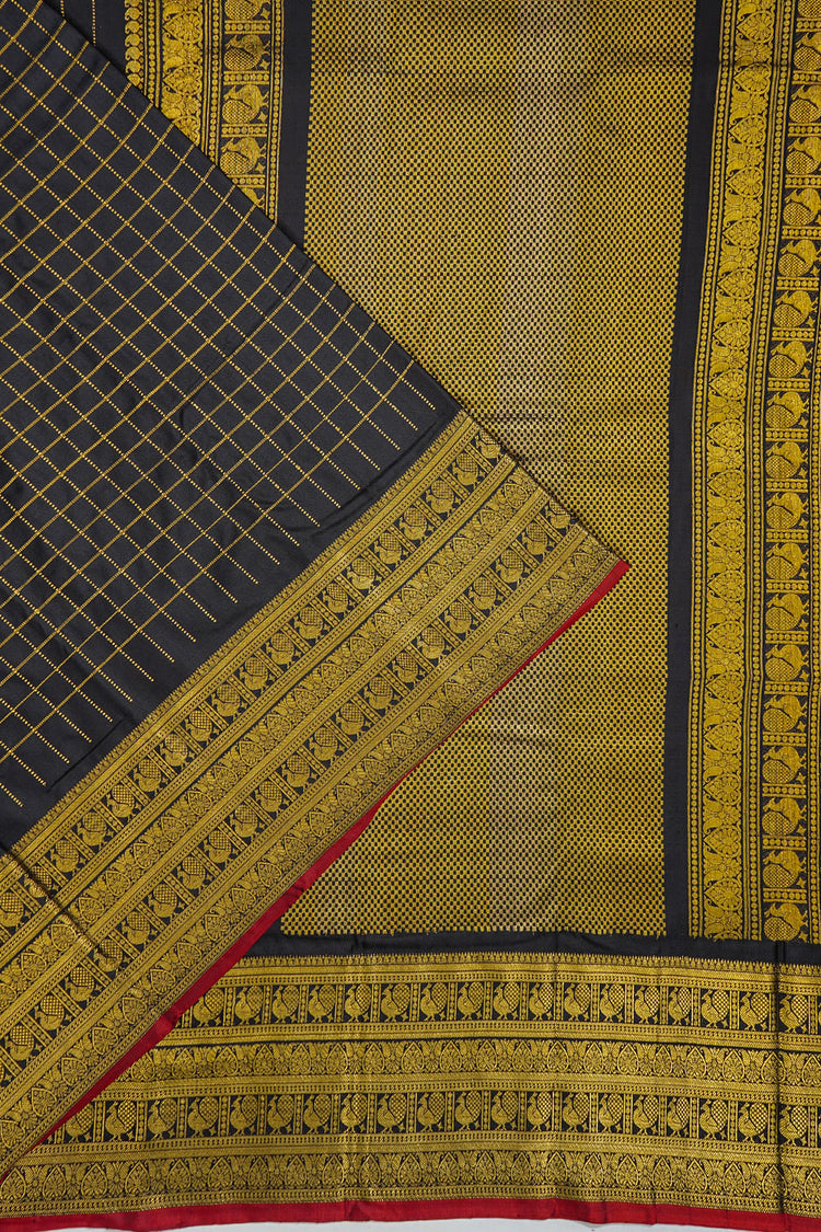 The body of this saree features gold zari checks on a deep black base, creating a striking and sophisticated design.