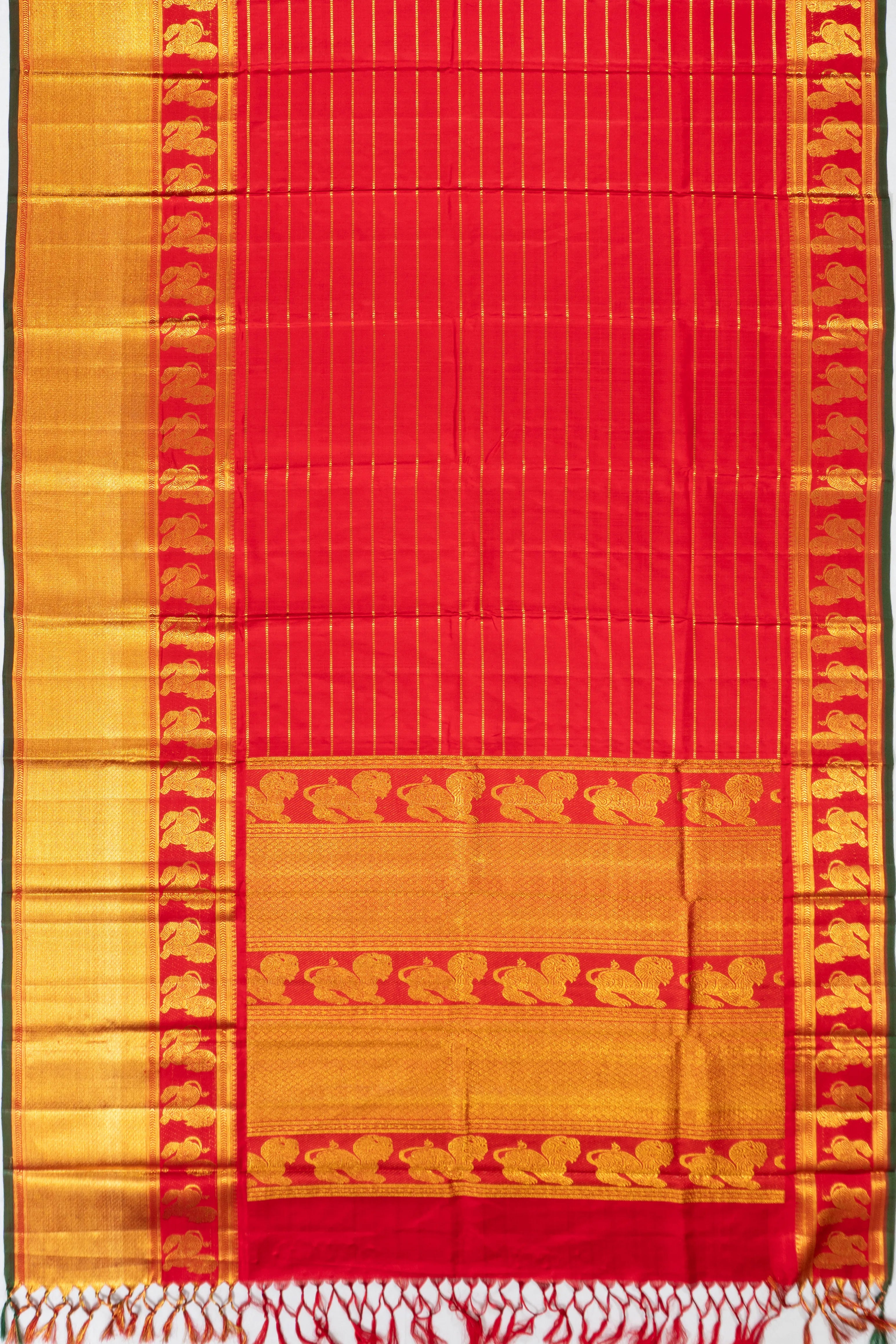 The rich red body is adorned with elegant gold zari horizontal lines, creating a mesmerizing arrow series that exudes sophistication and grace