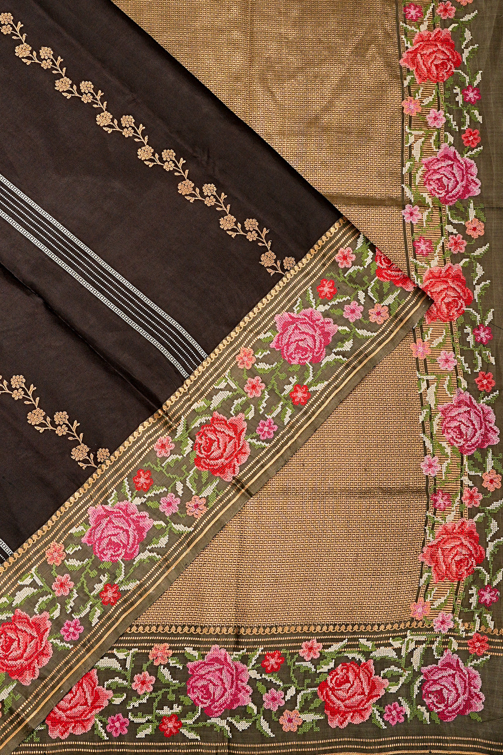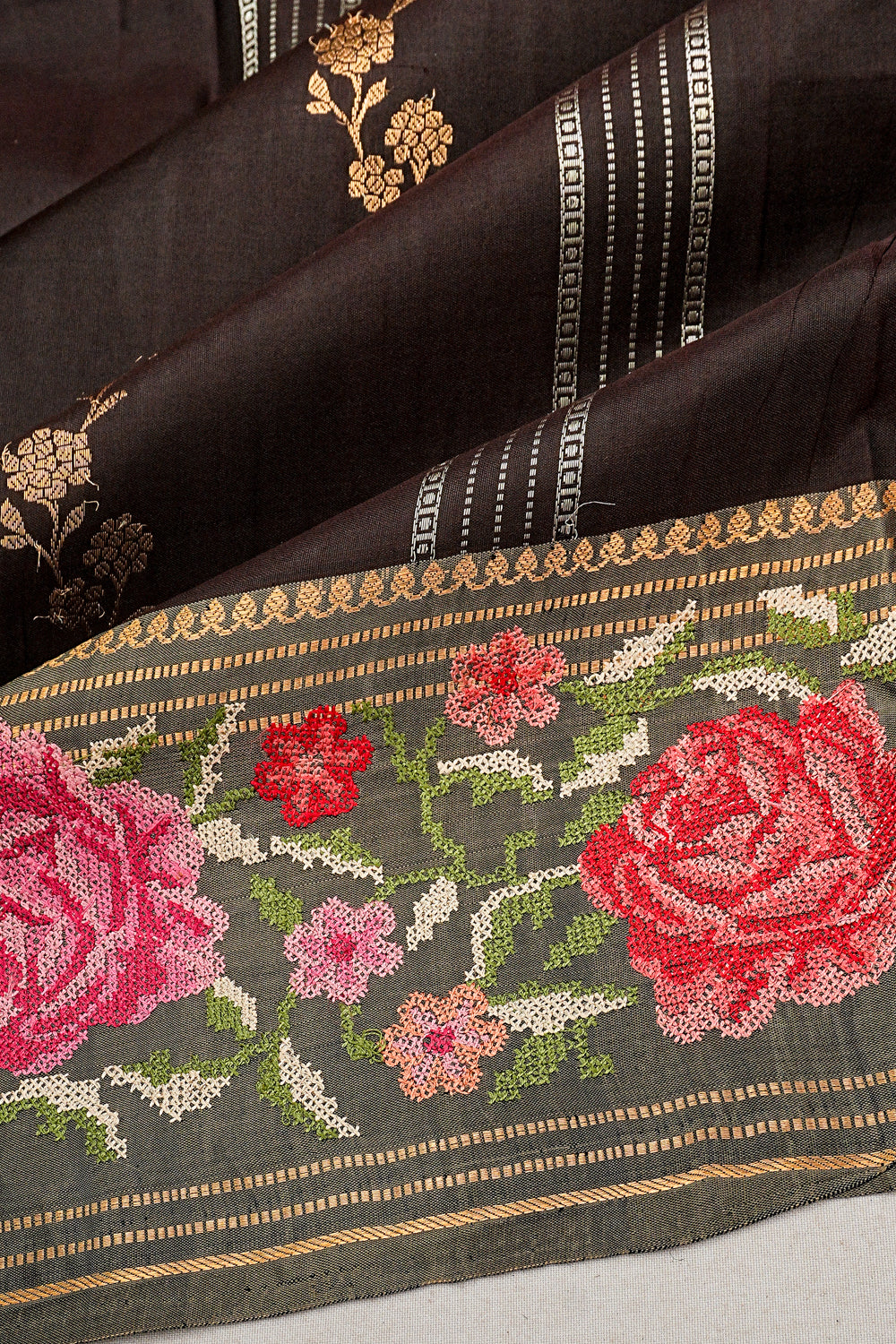 The body of this saree features silver zari vertical lines, with subtle yet intricate gold zari floral vines woven through, creating a beautiful contrast and depth