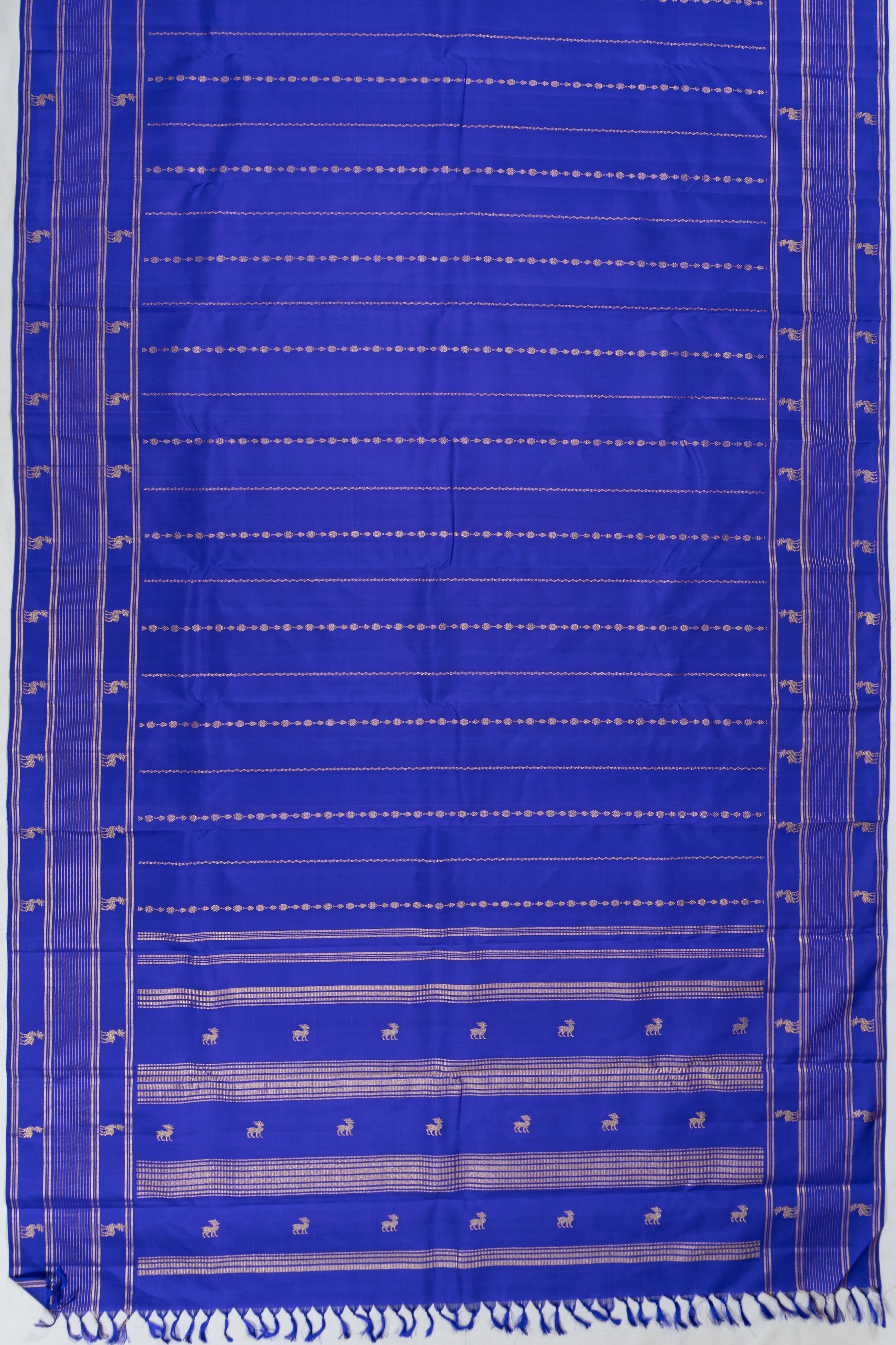The pallu mirrors this elegance with coordinated gold zari vertical lines and intricate deer motifs, offering a seamless flow of design