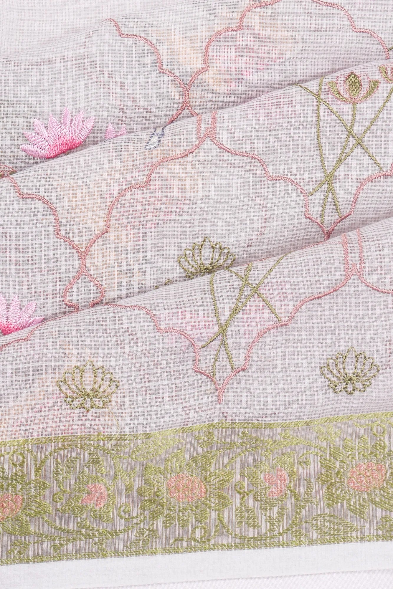 The self-embroidery floral vines create a graceful small border, while the pallu mirrors the saree's motif with its own floral embroidery brocade, enhanced with pichwai patterns