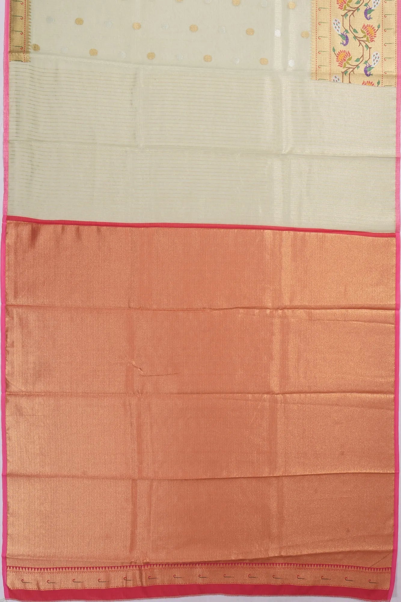The body is adorned with gold zari tissue, elegantly interspersed with silver zari polka dot buttas, offering a delicate sparkle and refined texture