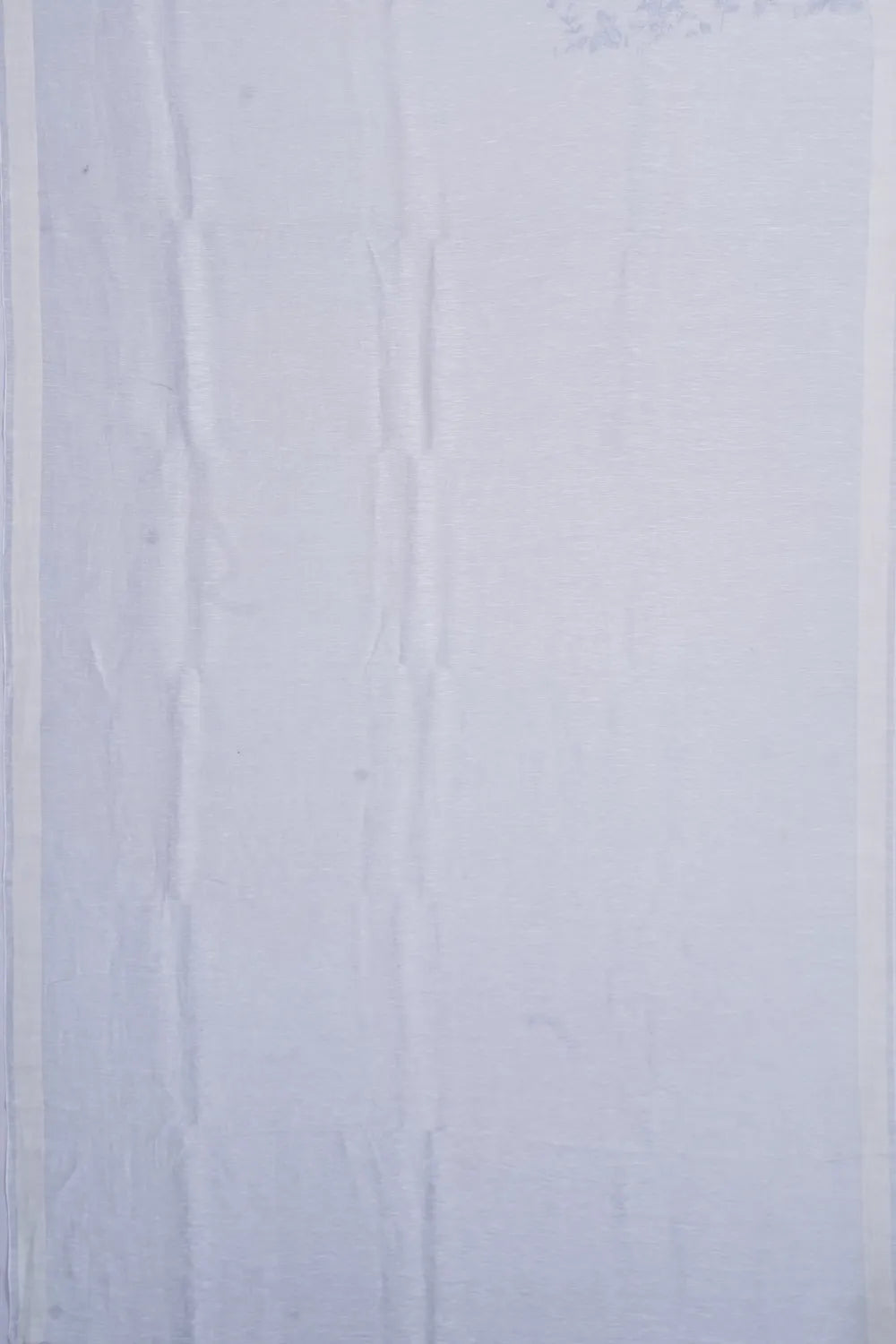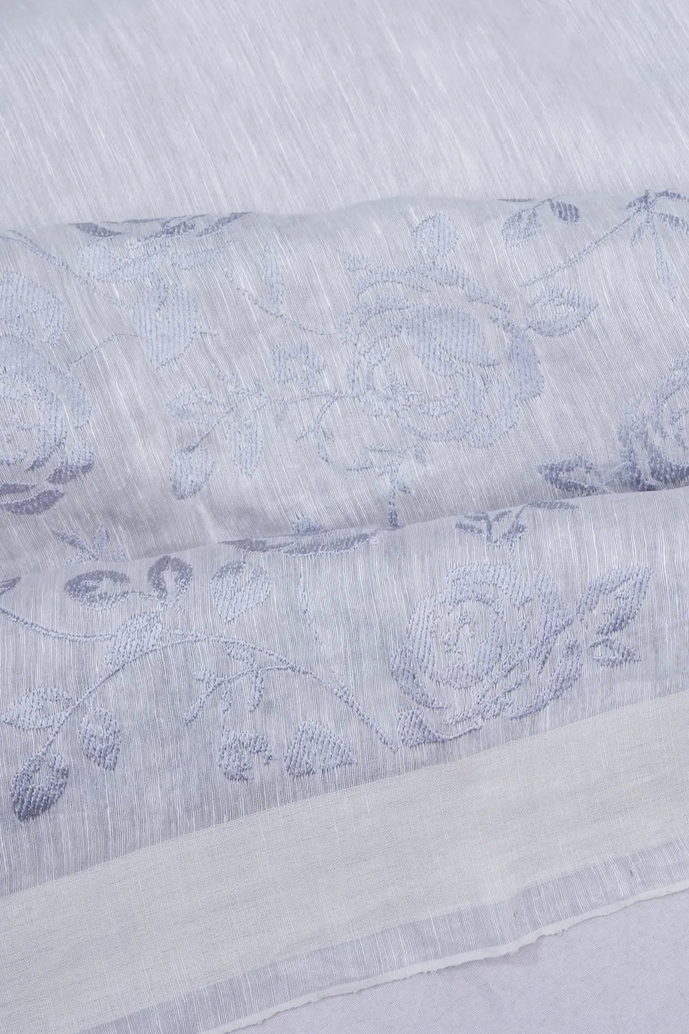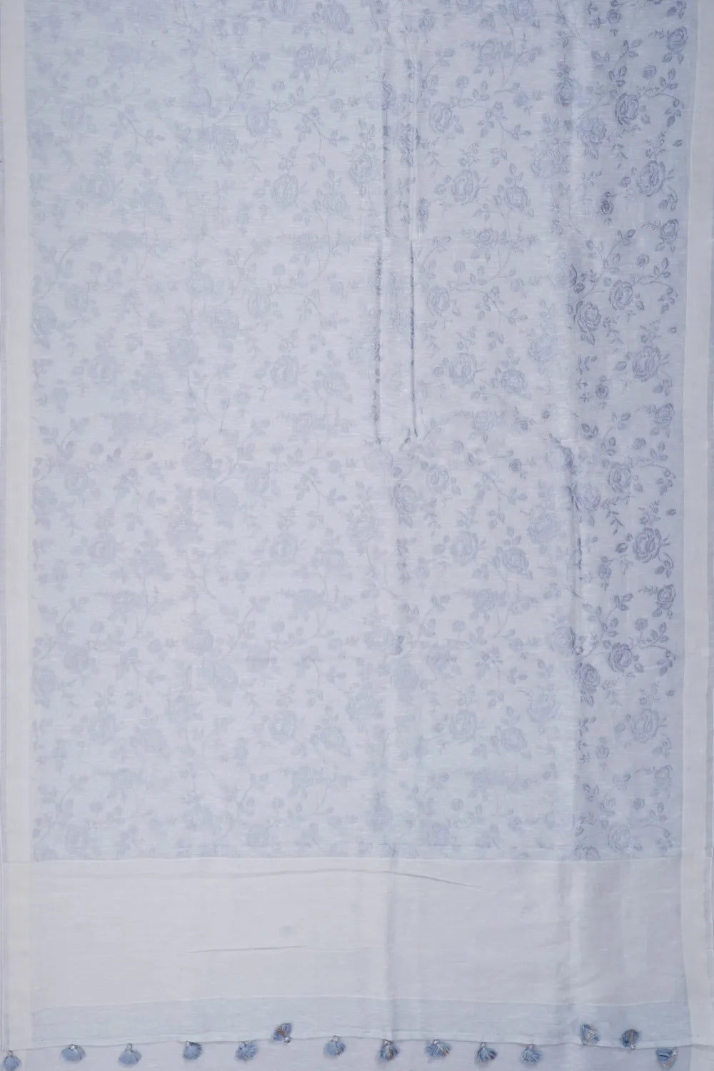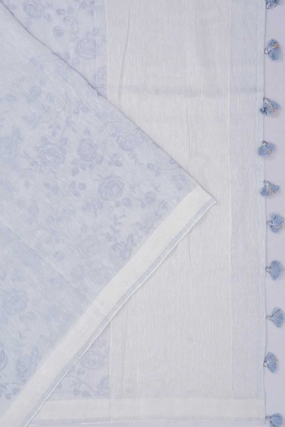 The saree's body is adorned with all-over floral embroidery, creating a delicate garden of motifs that dance across the pastel blue fabric, capturing the essence of timeless beauty