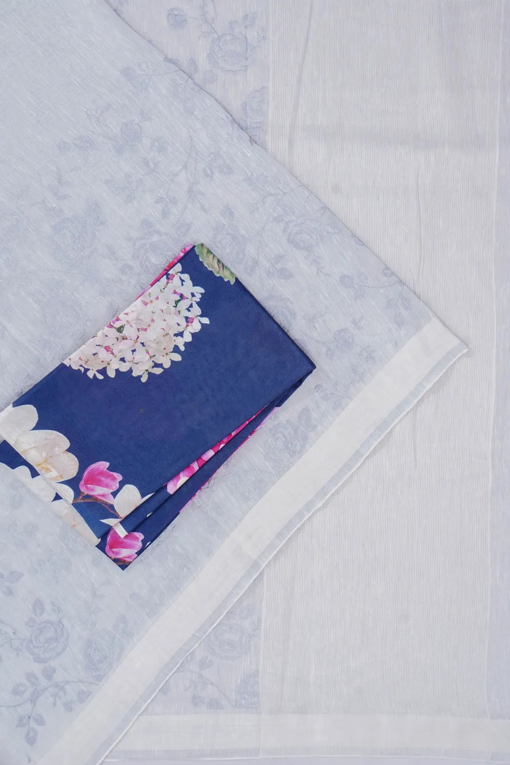 The harmonious design extends to the blouse, offering a seamless look with its self plain fabric, complemented by an extra floral printed dark blue blouse for added sophistication