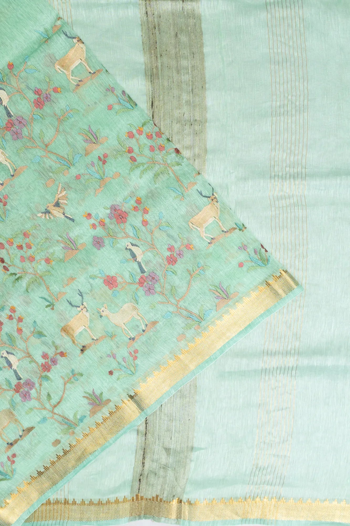The saree features a delightful interplay of multicolour floral embroidery, adorned with enchanting deer motifs, creating a canvas that is both vibrant and serene