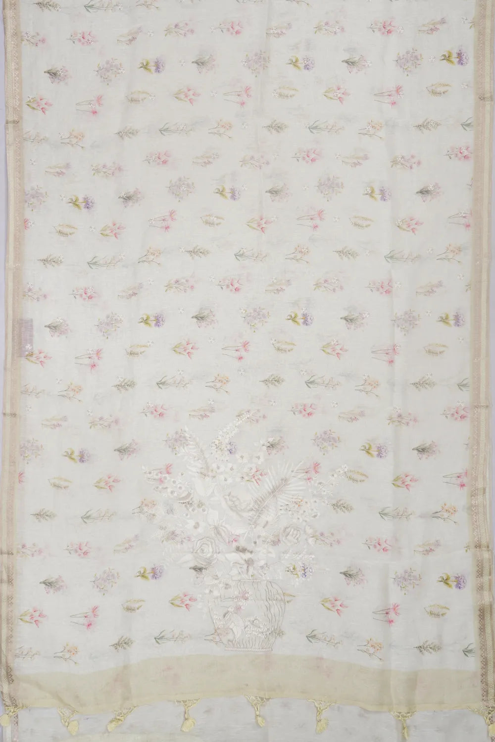 The self floral printed pallu, enriched with embroidery florals, flows beautifully, adding an extra layer of grace to your attire