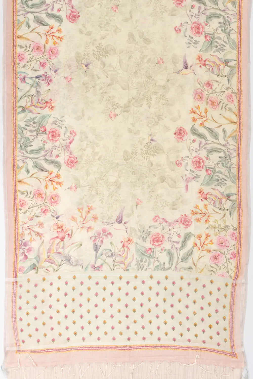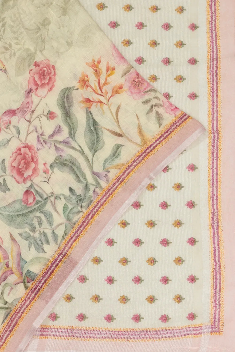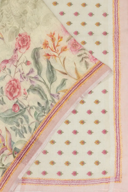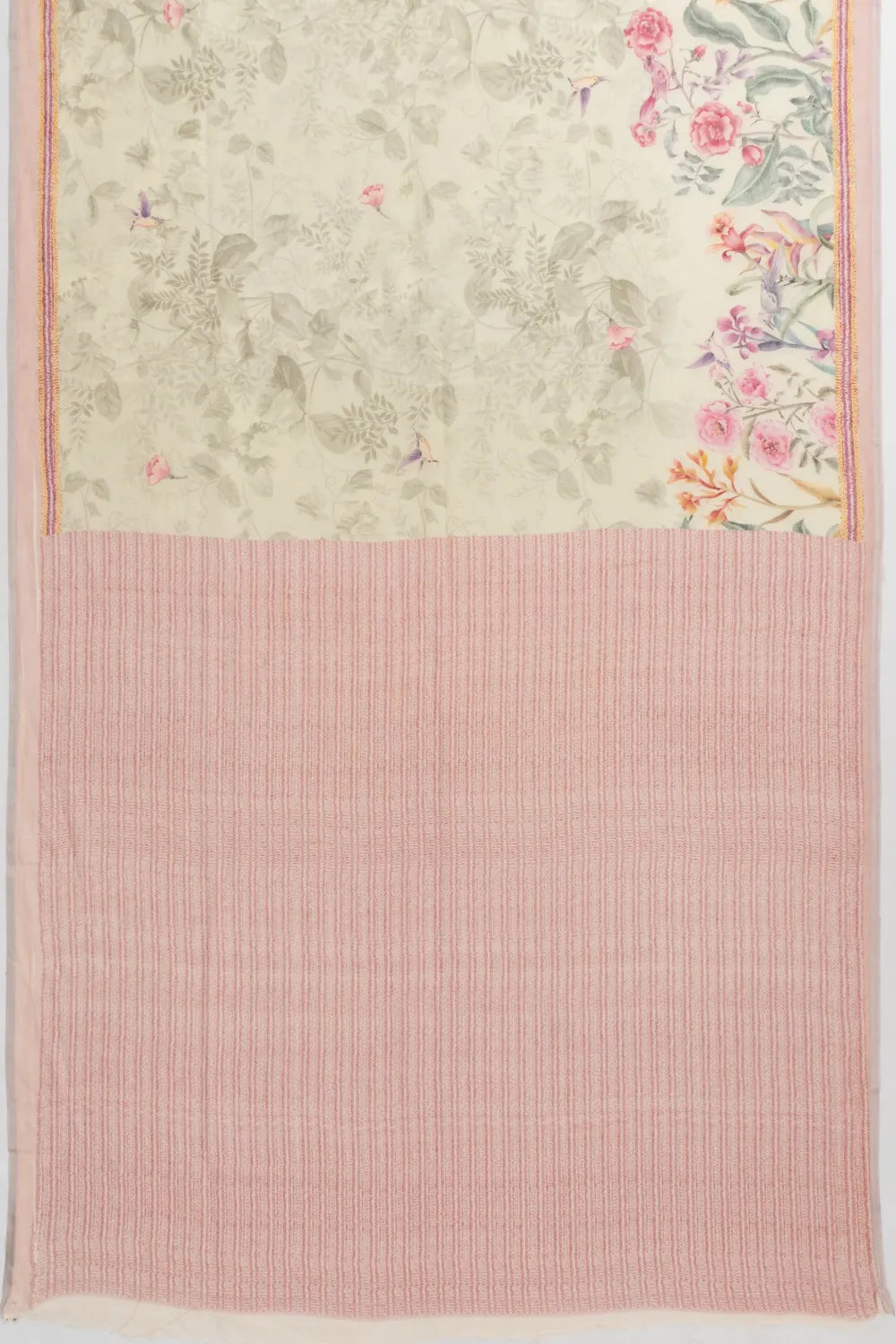 Body: Designed with charming floral prints, this saree exudes effortless grace on a pristine off-white base.