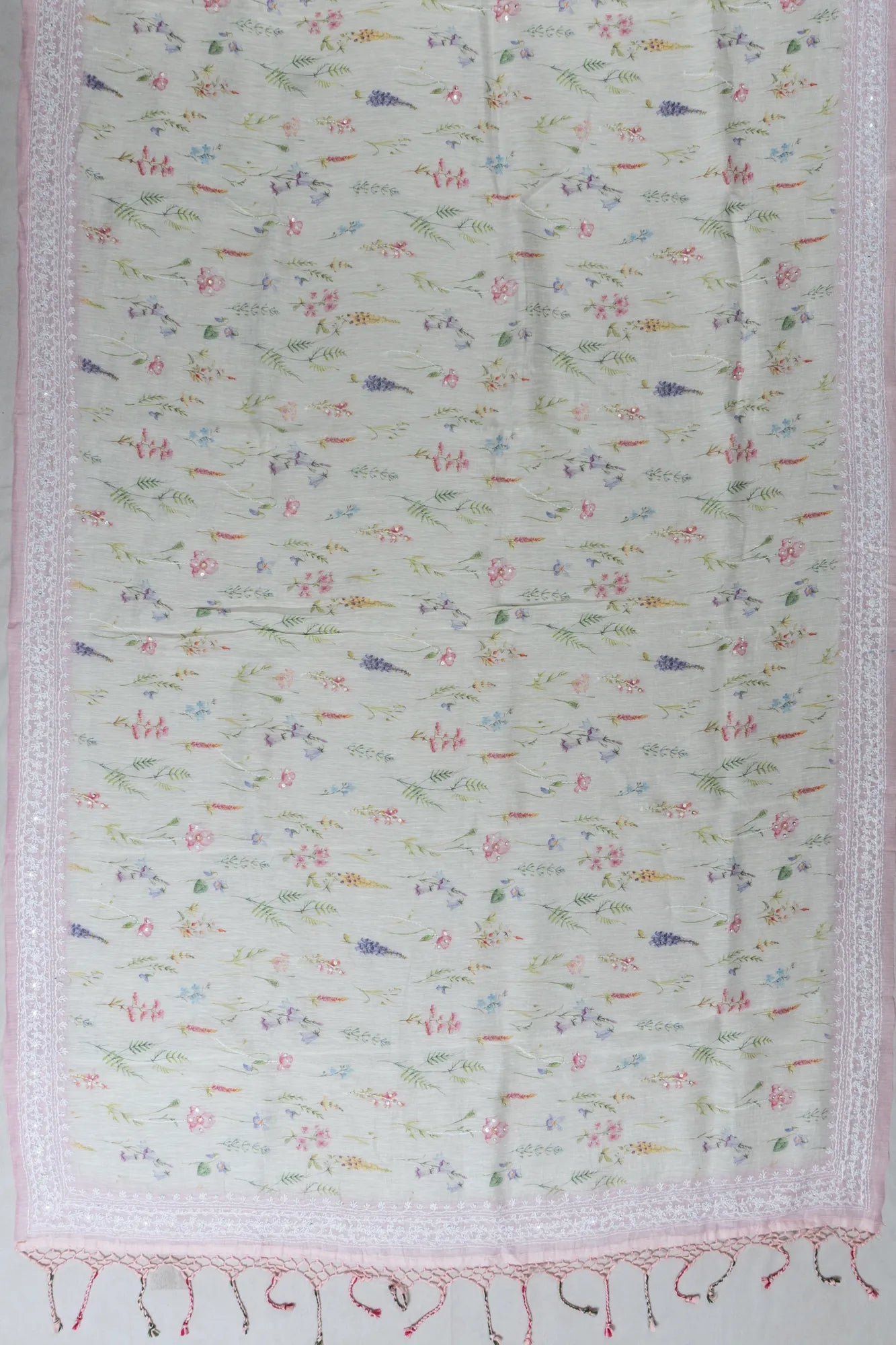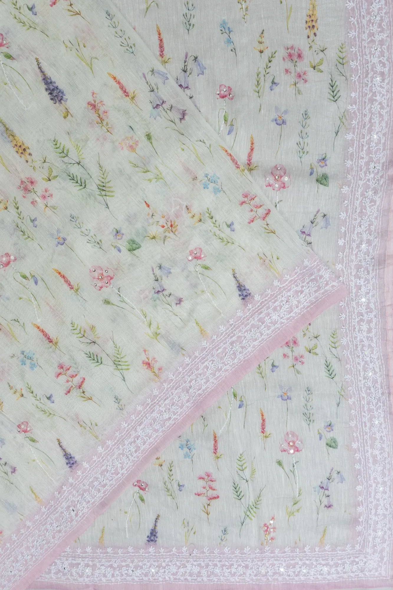 A baby pink border adorned with floral embroidery adds a gentle contrast, enhancing the saree’s graceful appeal