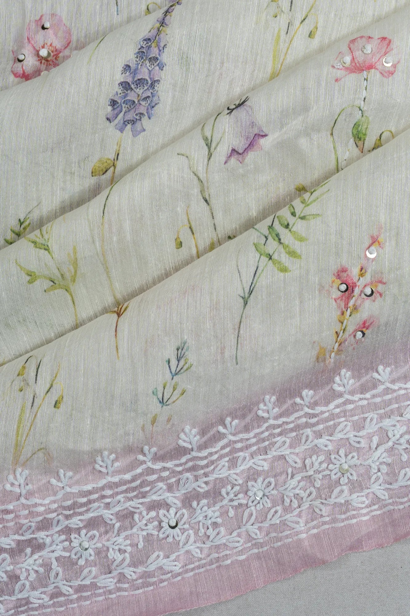 The saree's body boasts delicate floral prints interspersed with embroidered buttas and a subtle touch of sequin work, creating a harmonious blend of texture and pattern