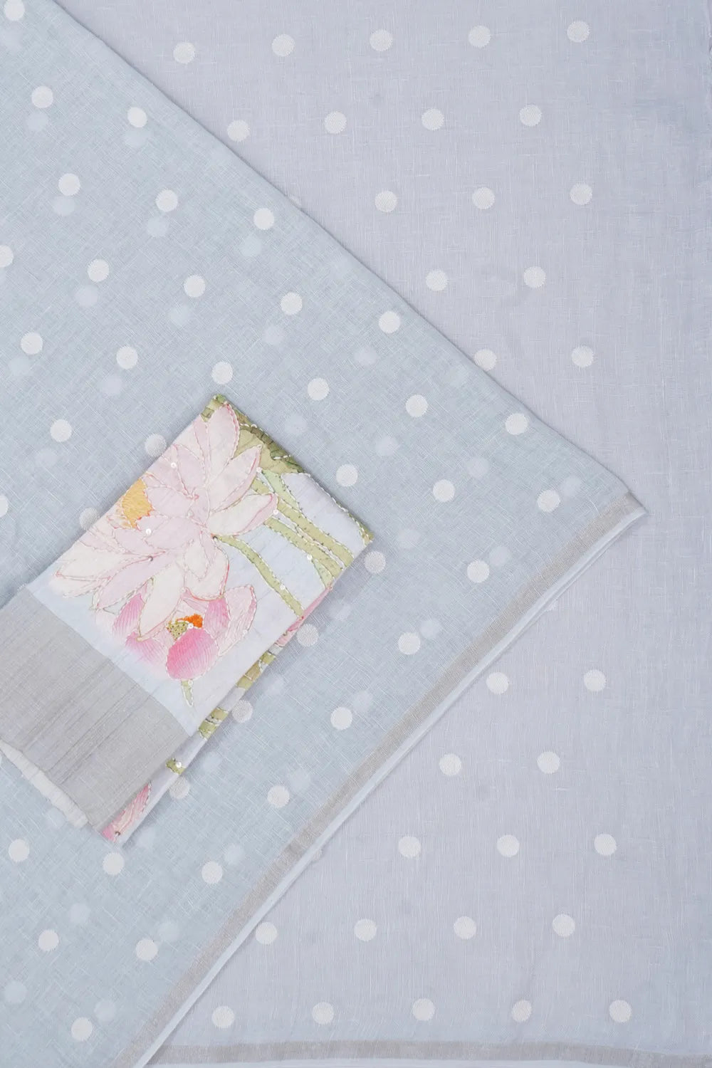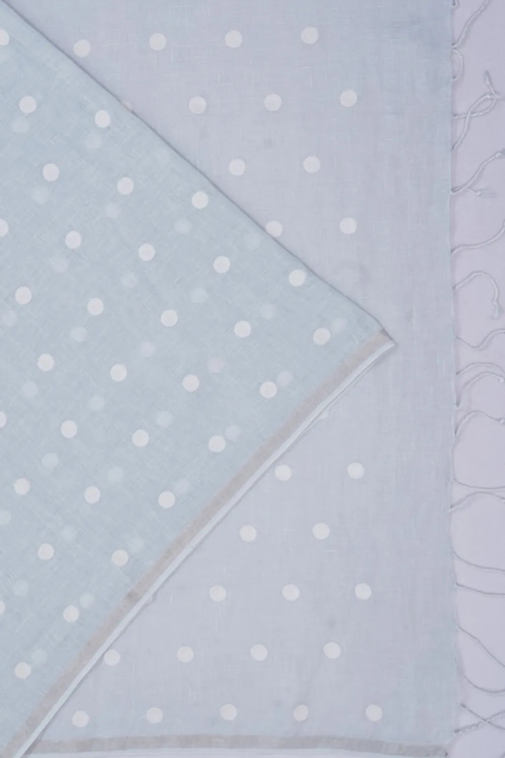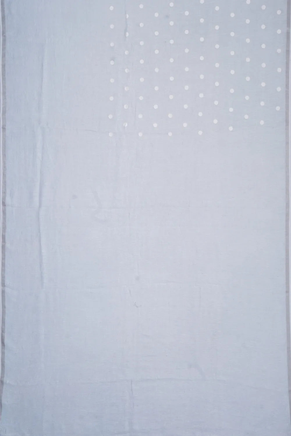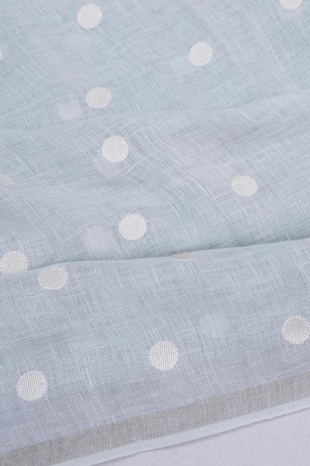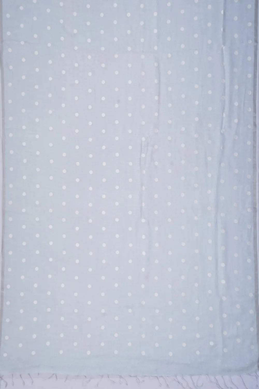 The saree's body is adorned with silver zari polka dot buttas, adding a touch of sparkle to the soothing pastel blue fabric
