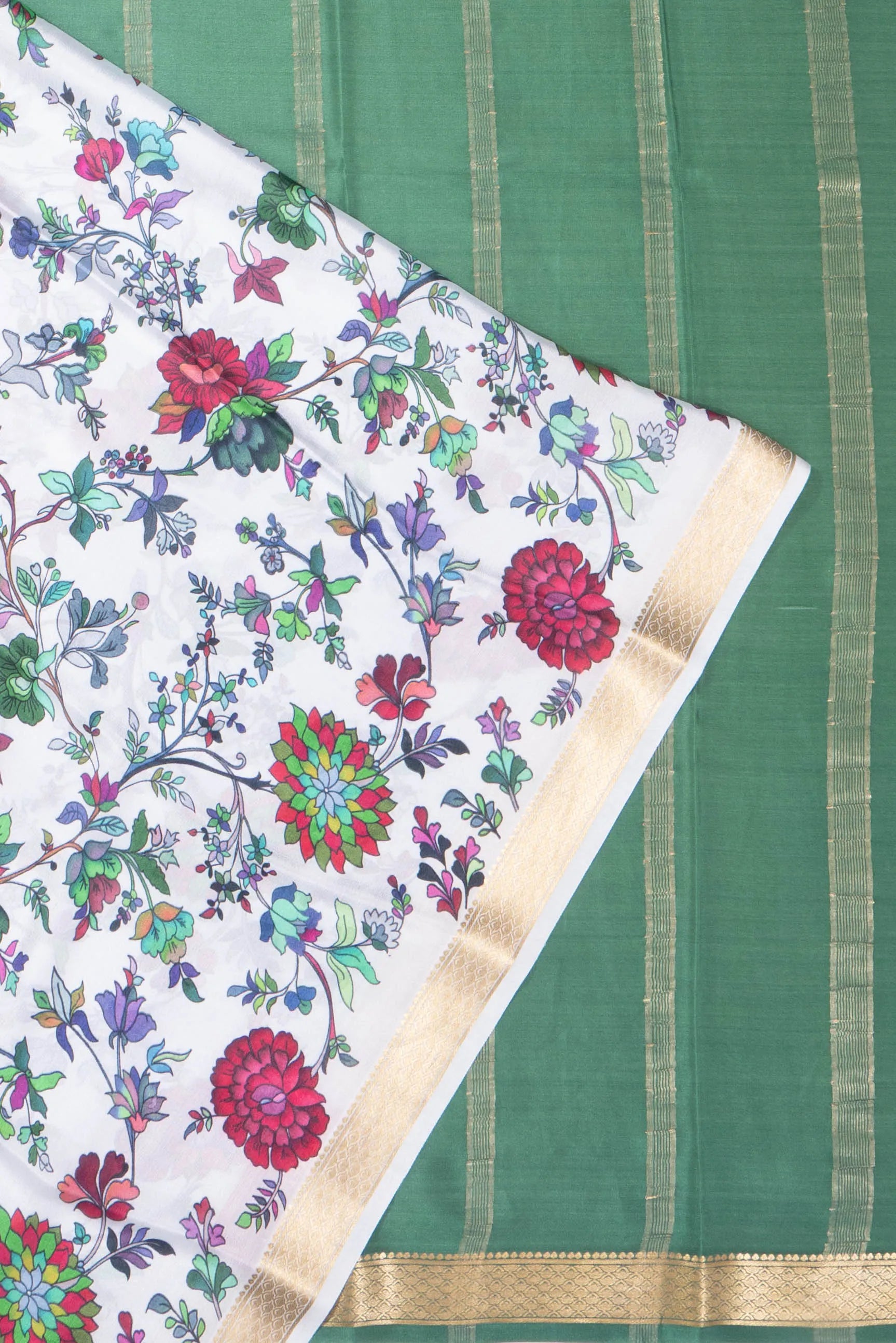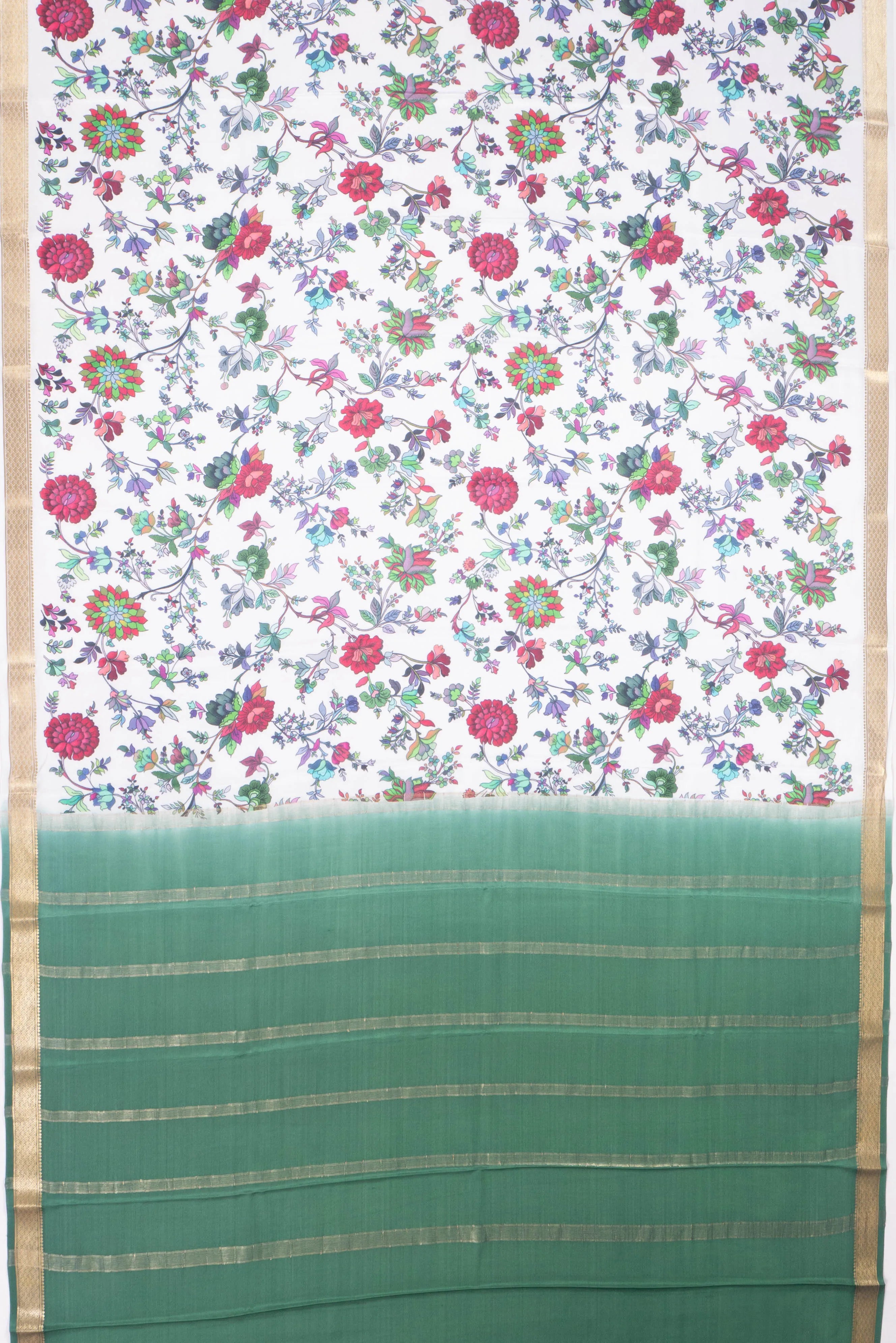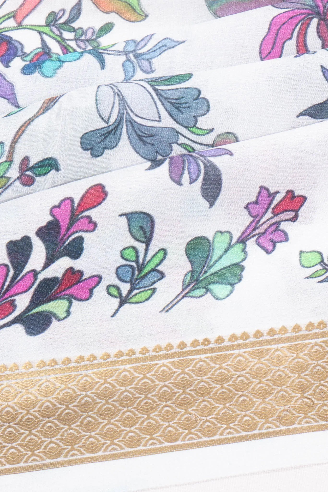 The body is adorned with delicate floral prints that dance across the white silk, creating a serene and elegant canvas