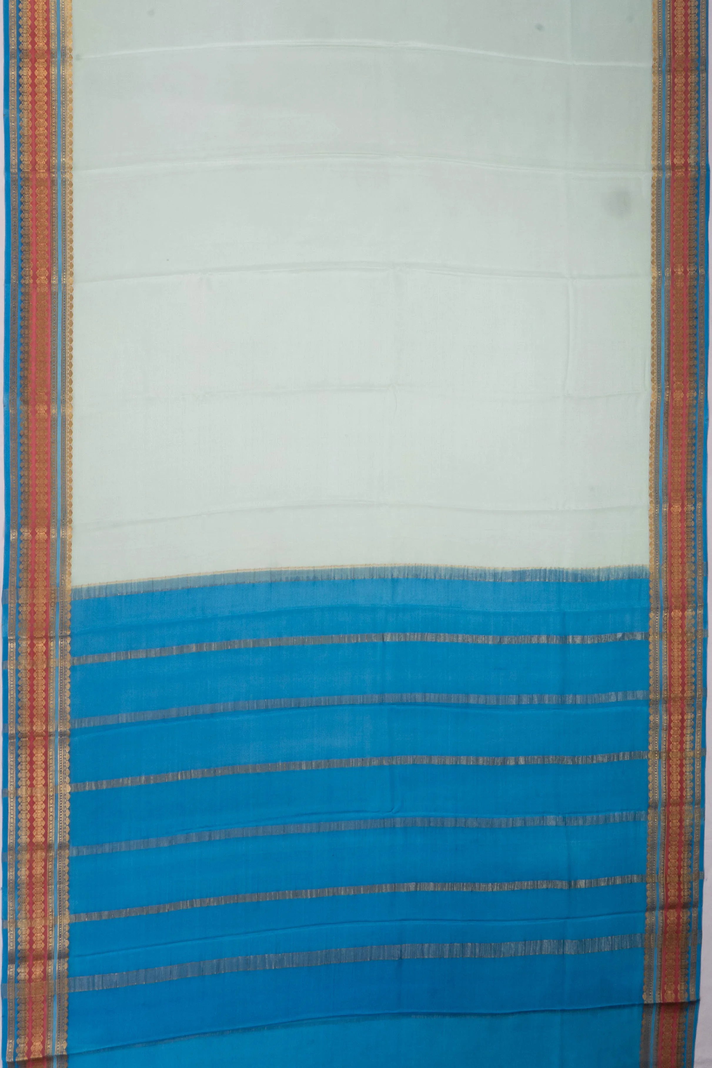 Accompanied by a complementary blue plain blouse with zari borders, this saree ensemble is a testament to refined craftsmanship