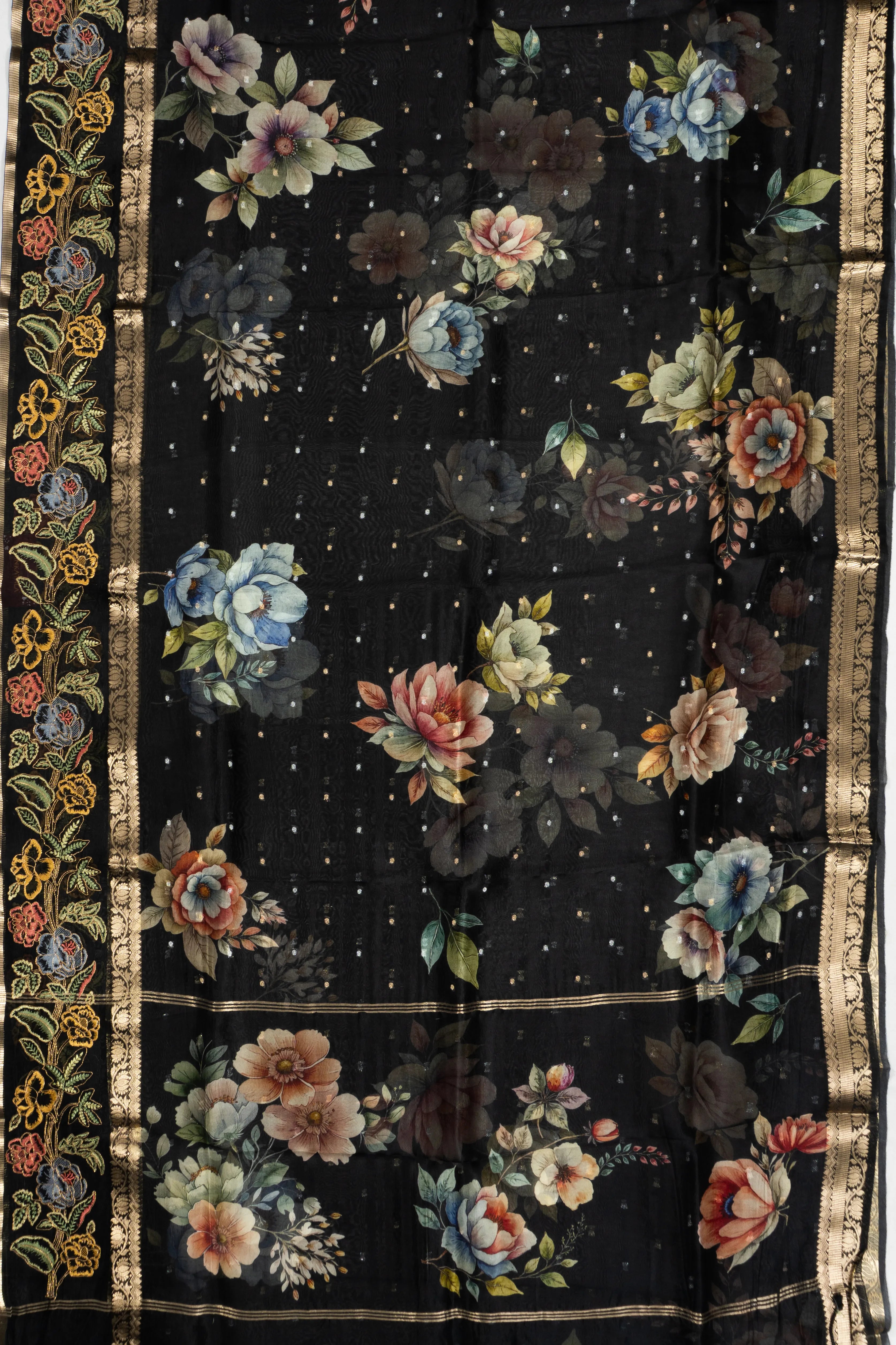 Embrace the allure of heritage with this exquisite Organza Floral Printed and Butta Black Saree, a true embodiment of grace and tradition The saree's body features delicate floral prints, elegantly paired with gold and silver zari polka dot buttas, creating a striking yet sophisticated appearance