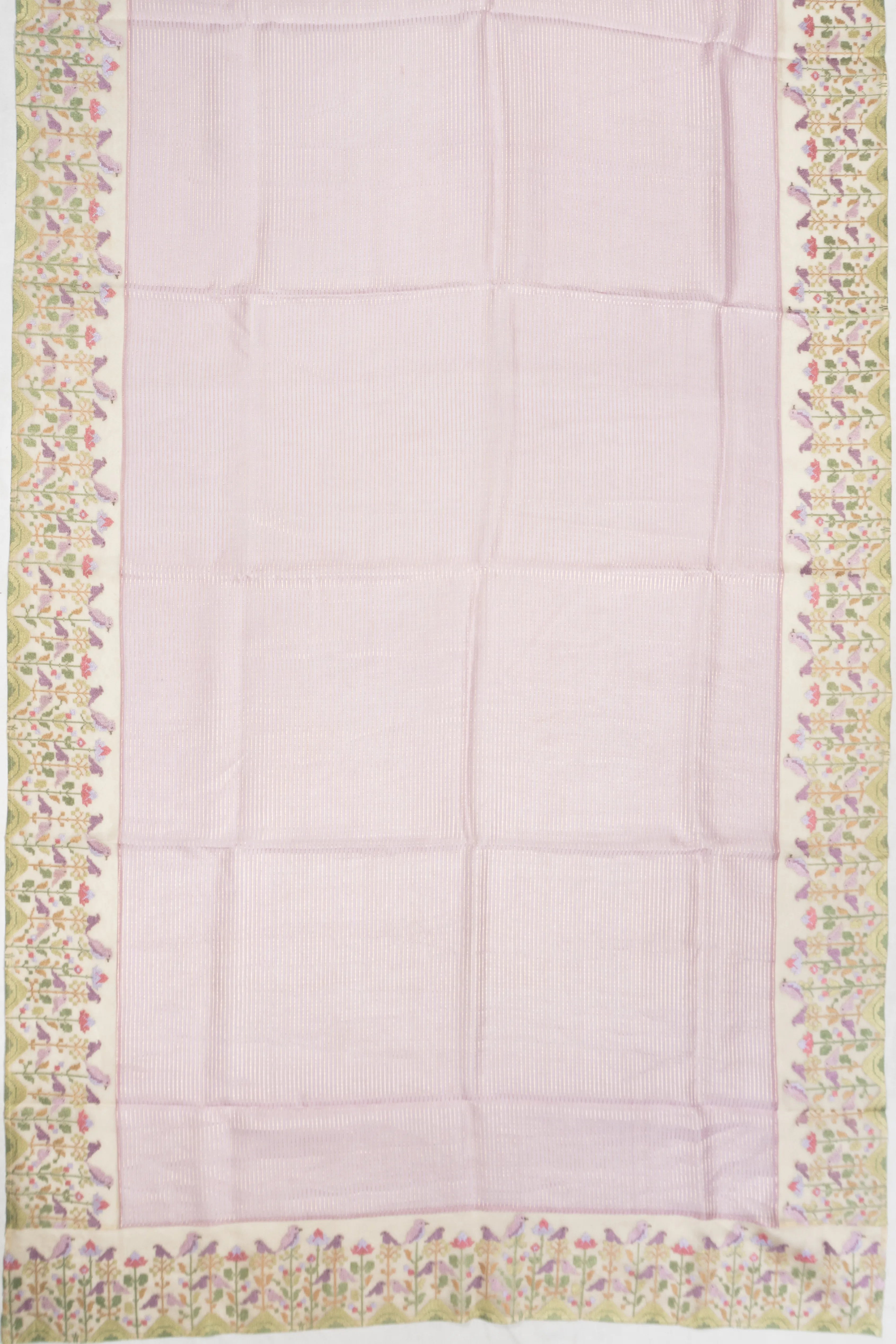 The contrast border is adorned with multicolour floral embroidery and delicate bird motifs, enhancing the sarees graceful appeal