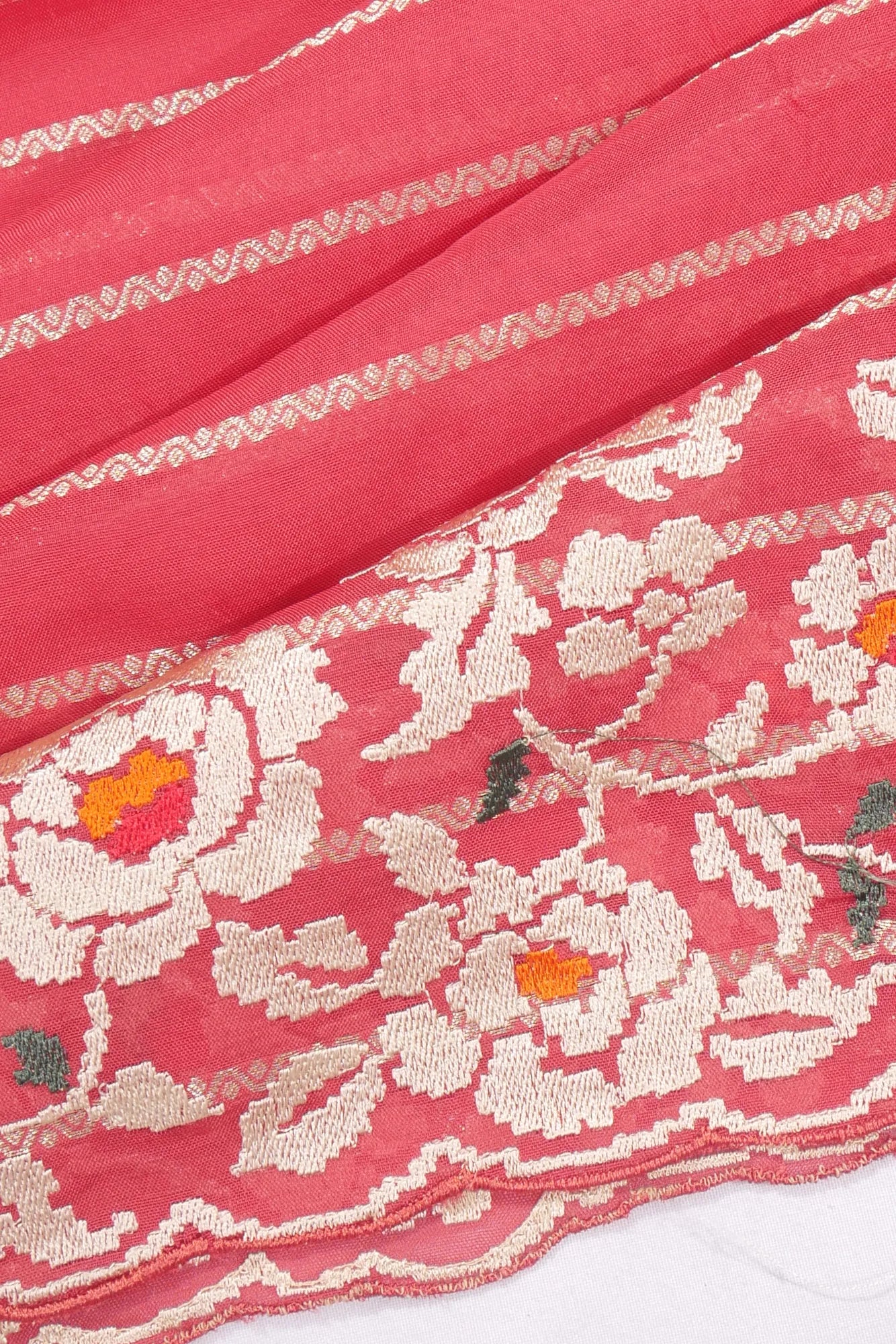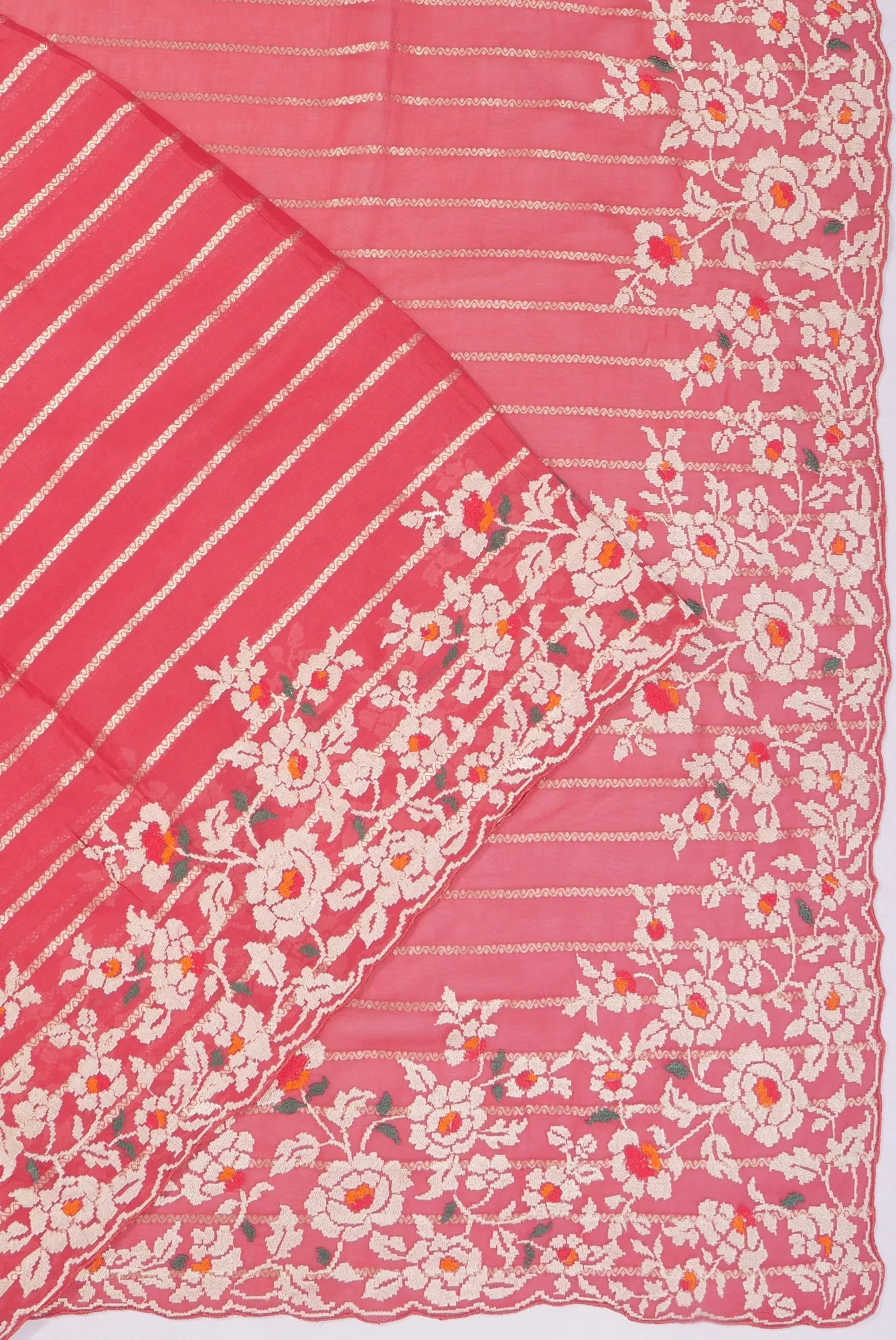 Organza Horizontal Lines Red Saree With Embroidery Scallop Border