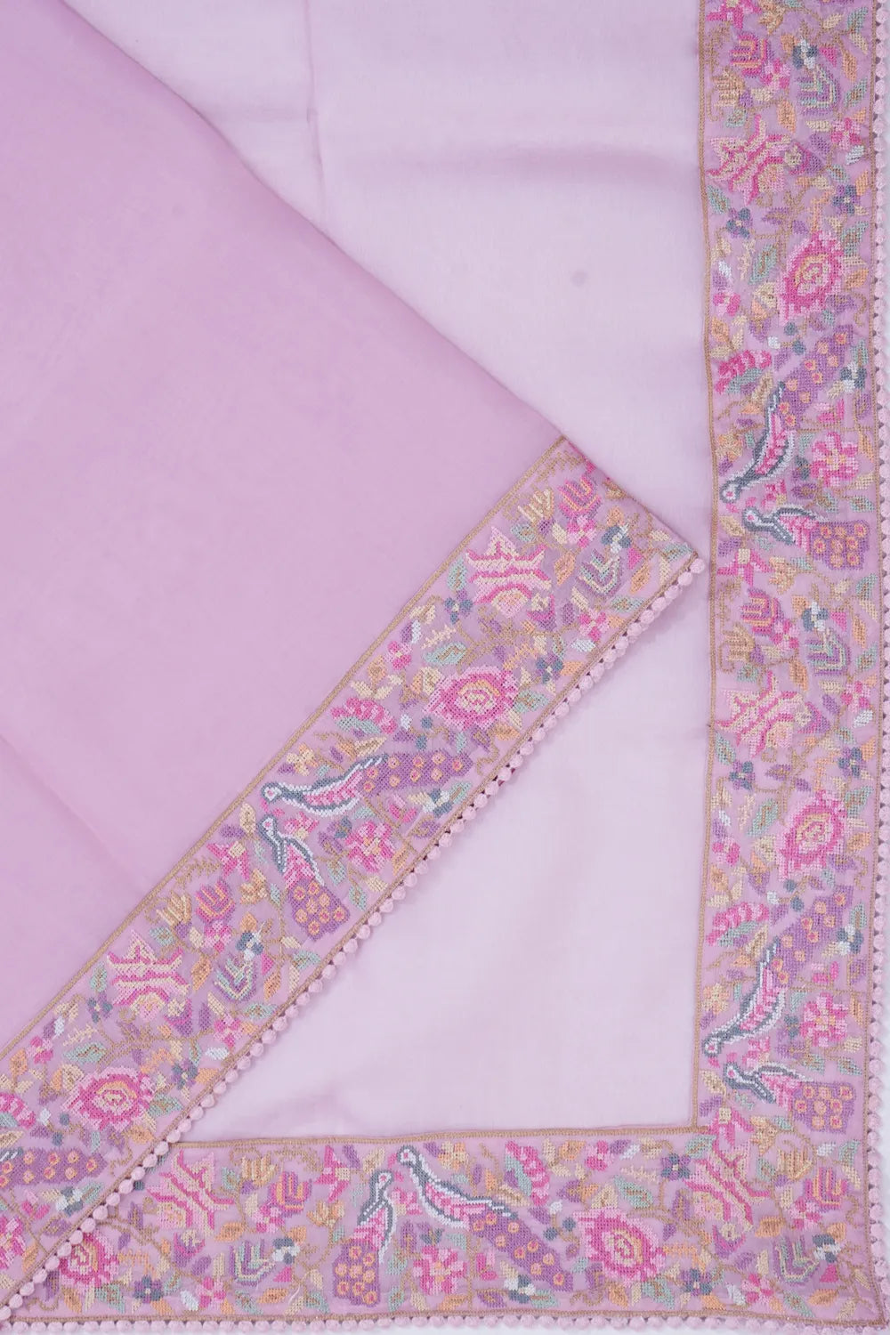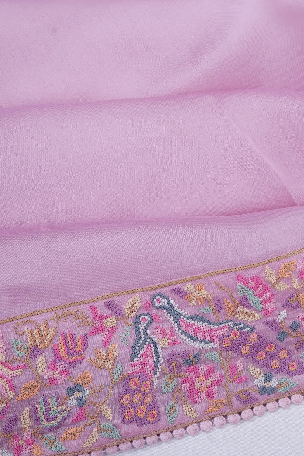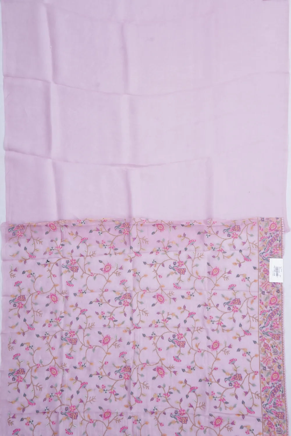 The saree's understated plain body is elegantly offset by a self-border, embellished with multicolour floral embroidery and intricate peacock motifs that speak of timeless grace