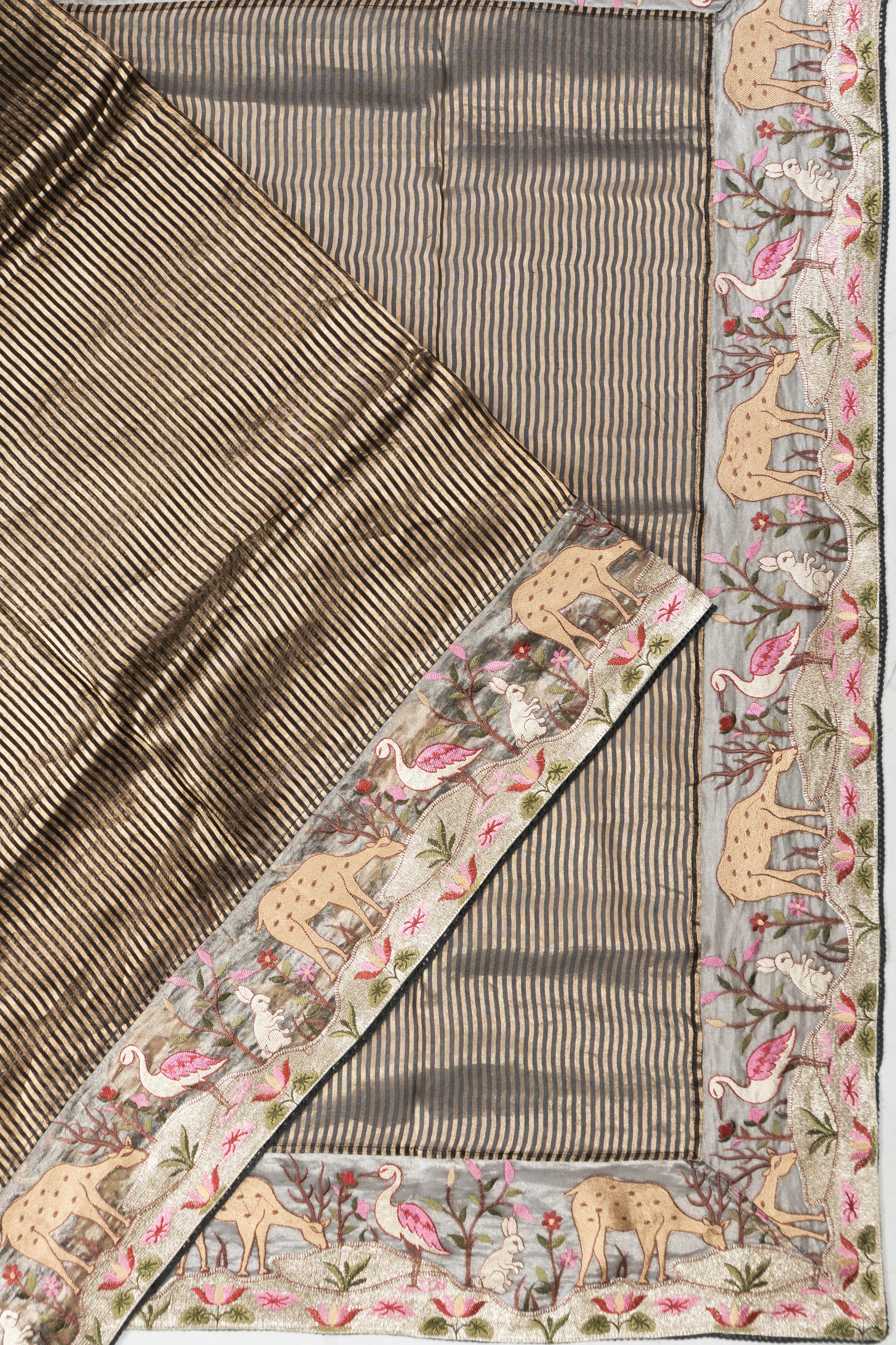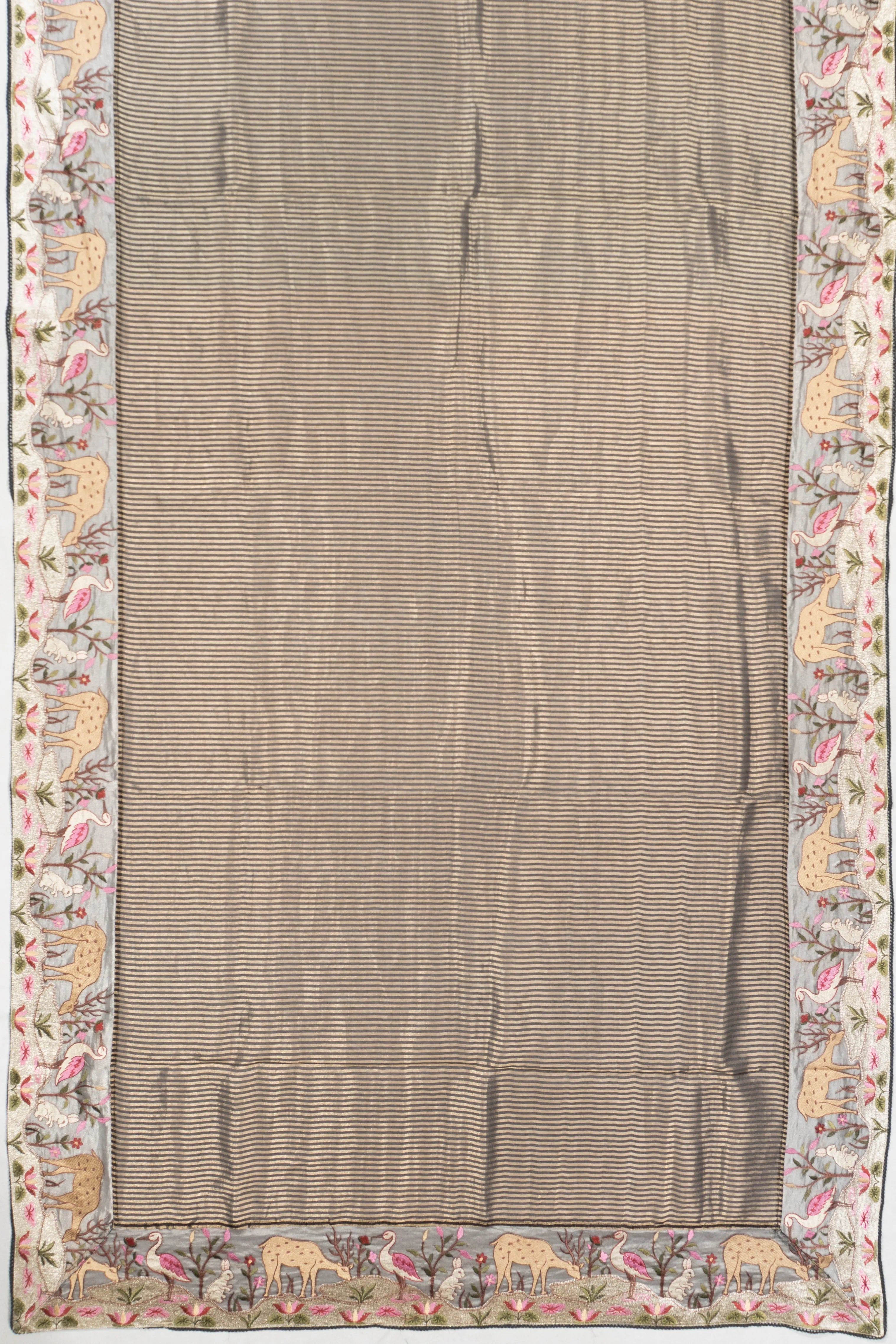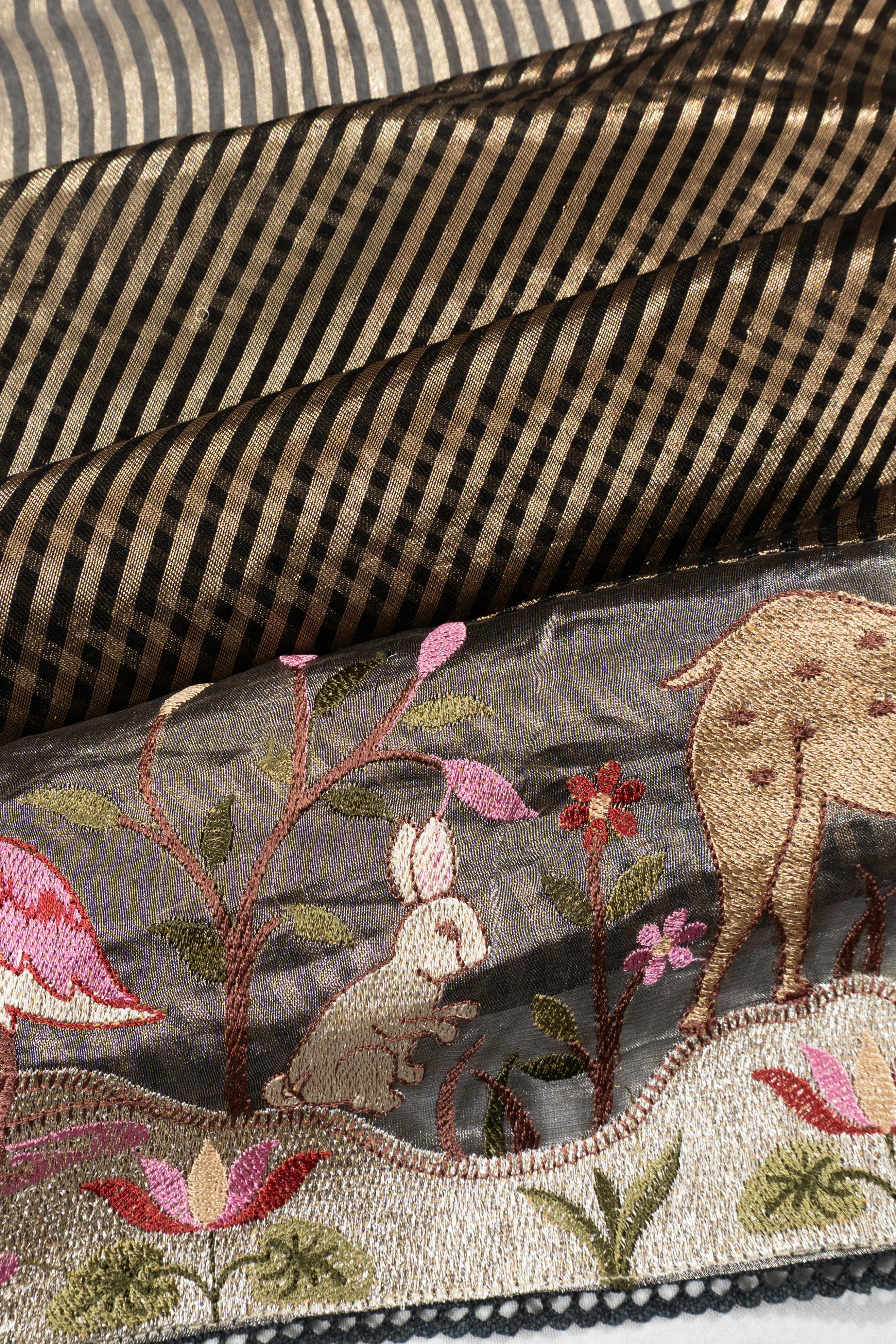 Its self-embroidery border, adorned with intricate deer, swan, and rabbit motifs nestled among florals, adds a touch of heritage-rich charm