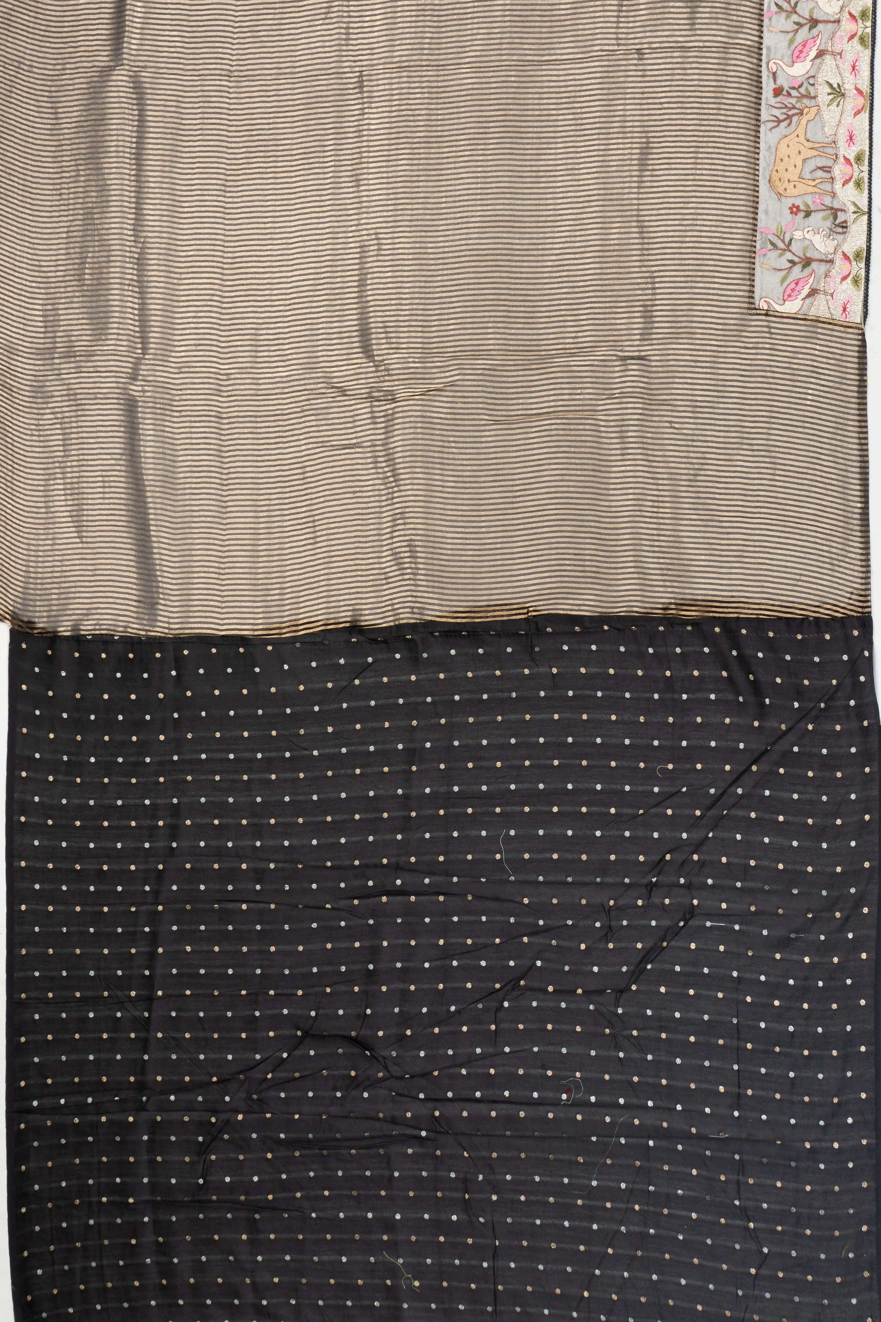 Paired with a complementary blouse featuring gold and silver zari floral buttas, this ensemble creates a harmonious and elegant look