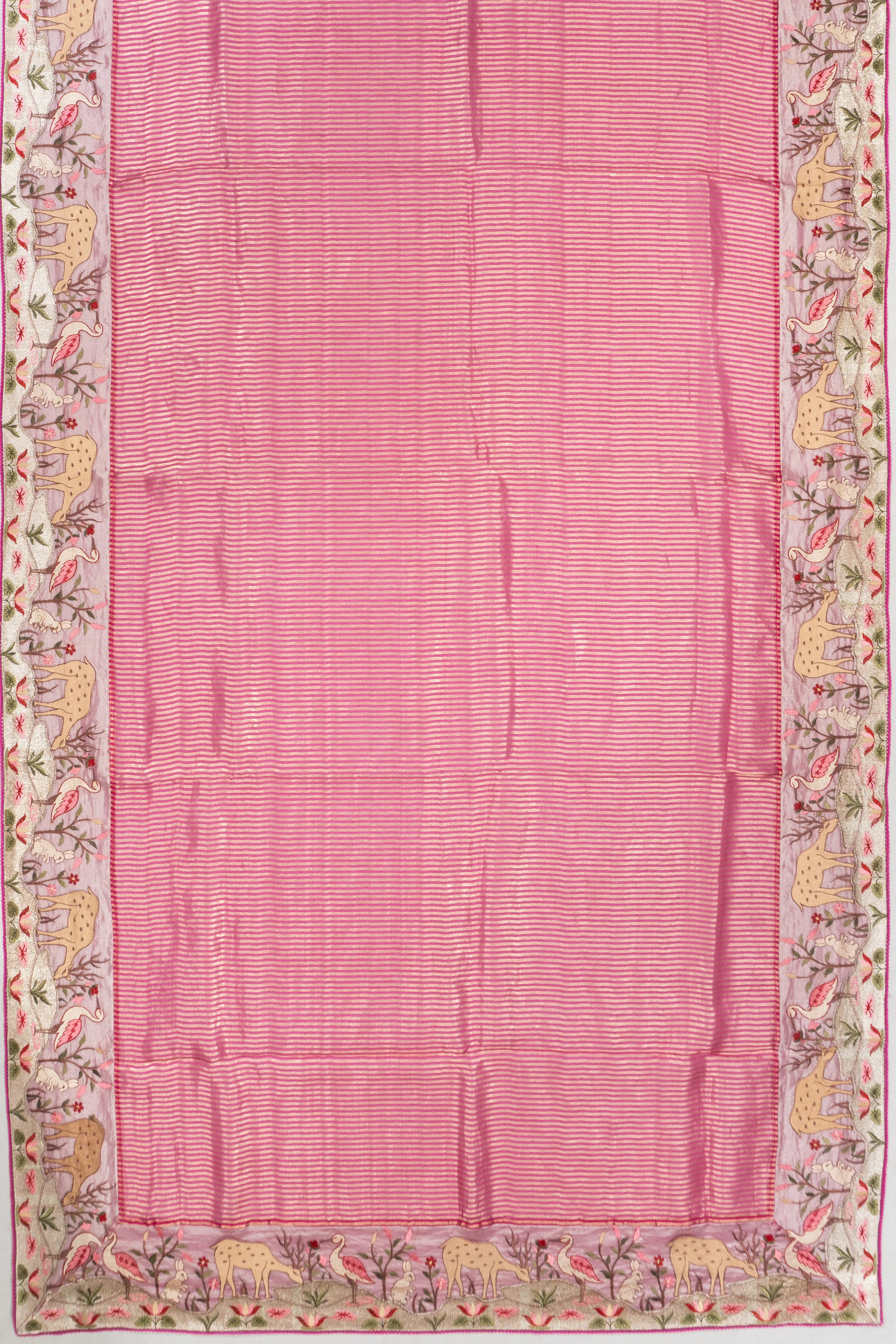 The border is adorned with self-embroidery, showcasing charming deer, swan, and rabbit motifs nestled among delicate florals