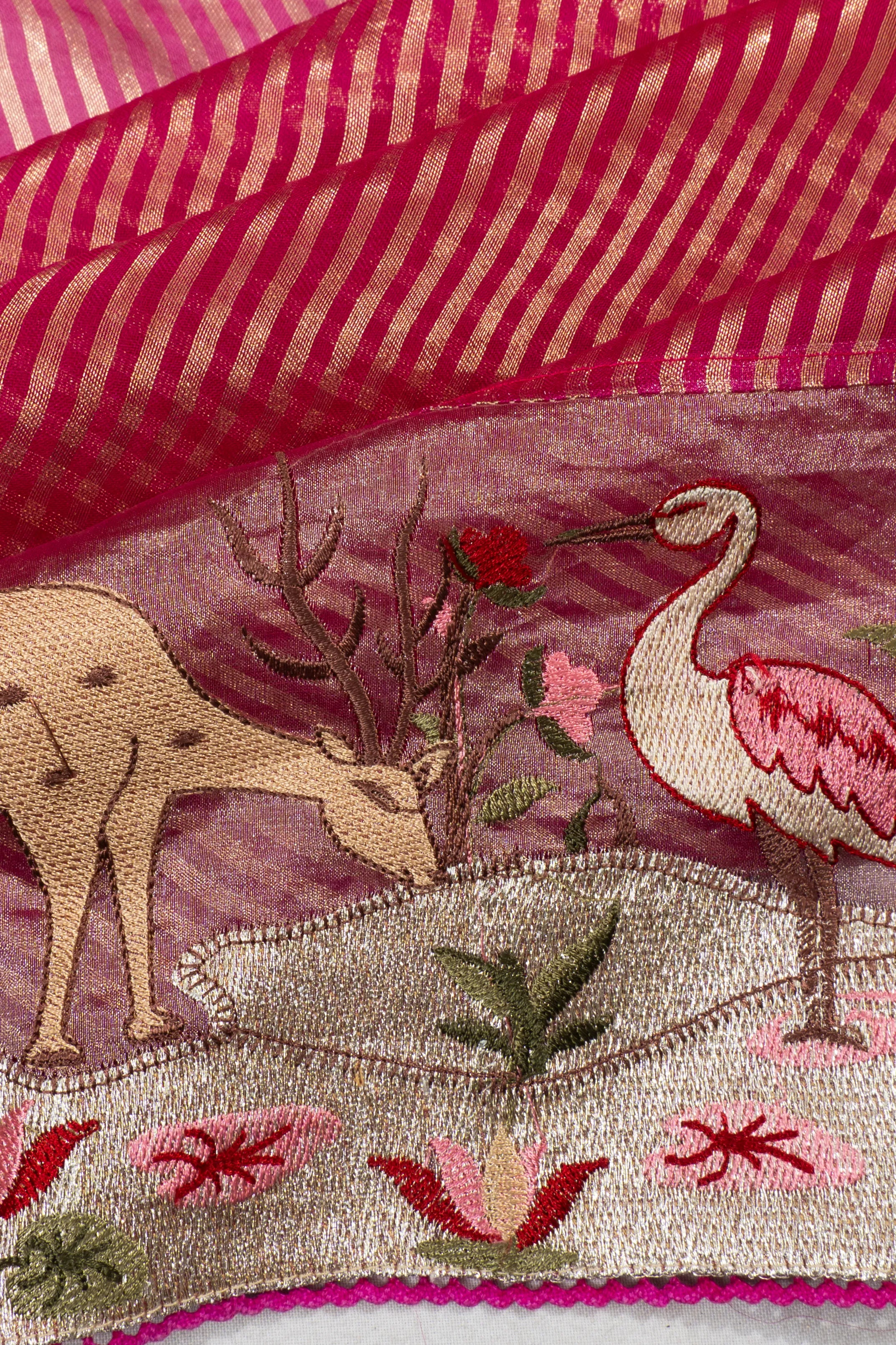 The saree features gold zari vertical lines that create an exquisite texture, enhancing the luxurious sheen of the fabric