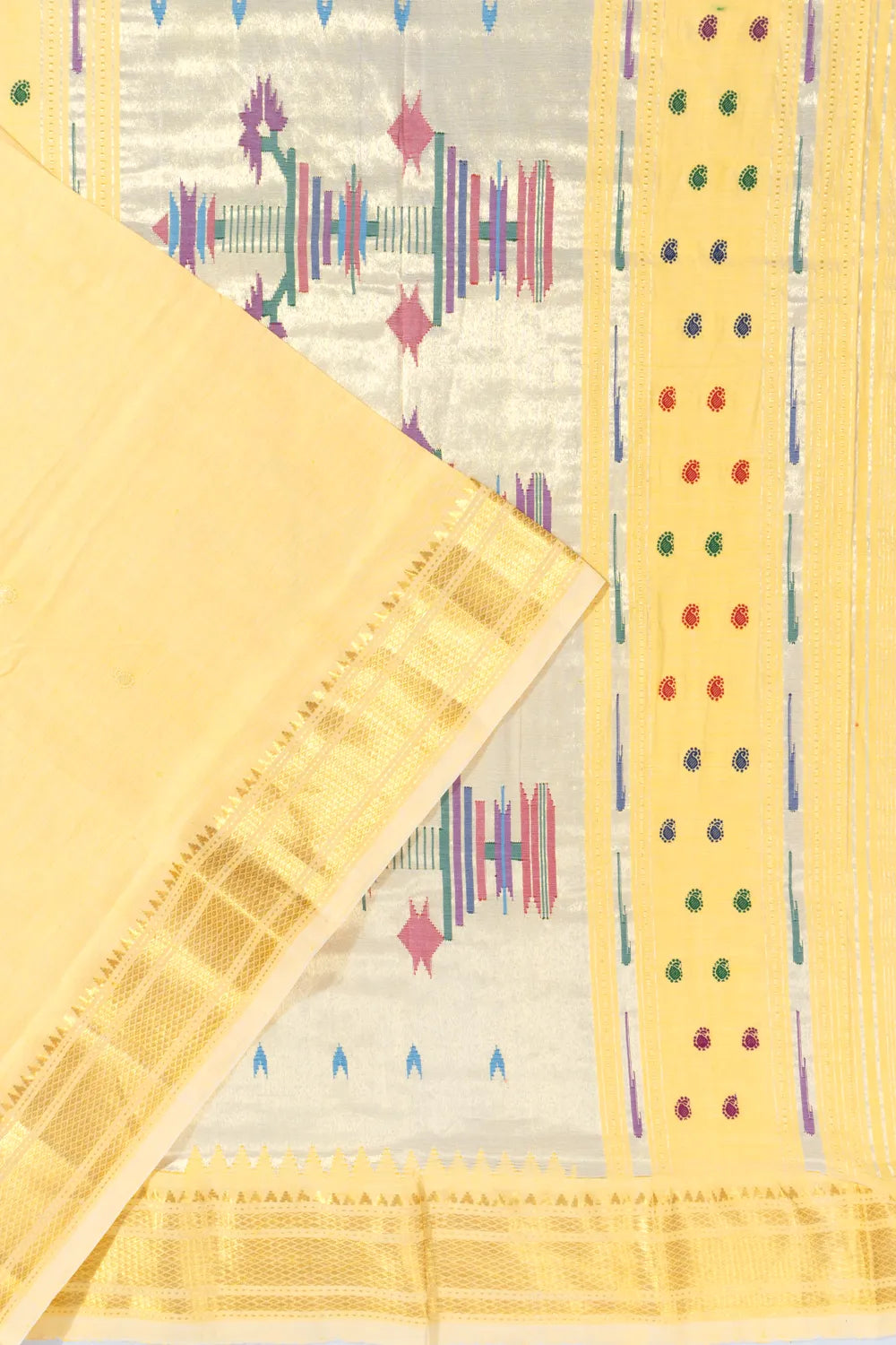 The tissue pallu is beautifully decorated with floral vines and multi-colored threaded paisley buttas, adding a pop of color and intricate detailing that catches the eye.