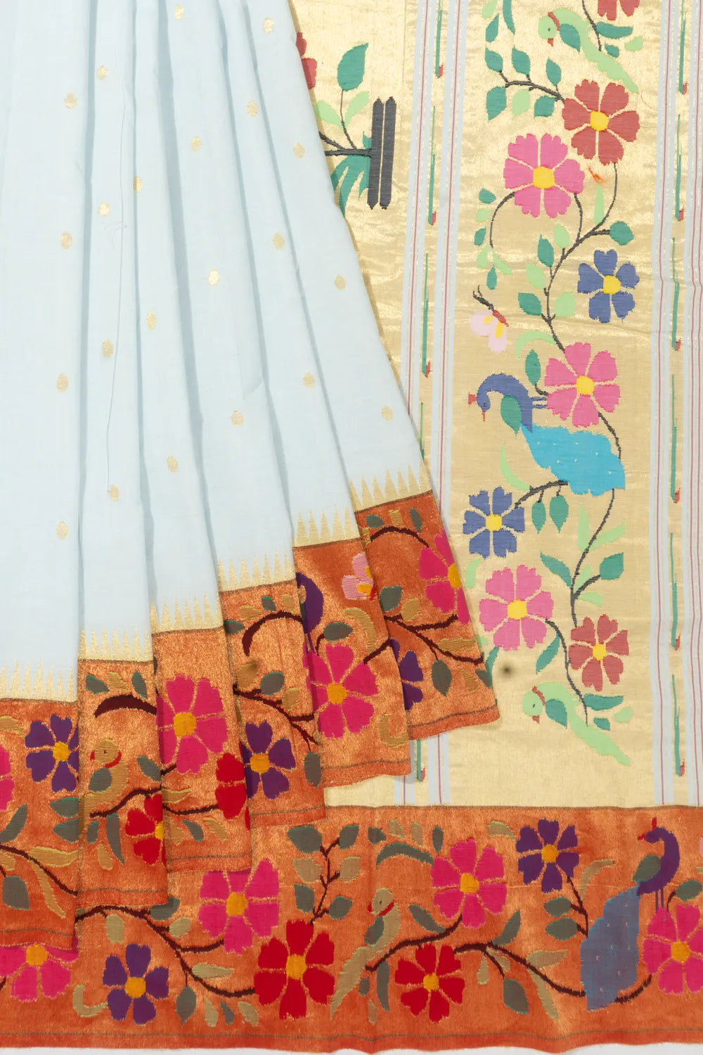 Body: Soft powder blue cotton base adorned with delicate gold zari polka dot butta, lending a subtle shimmer and traditional charm.