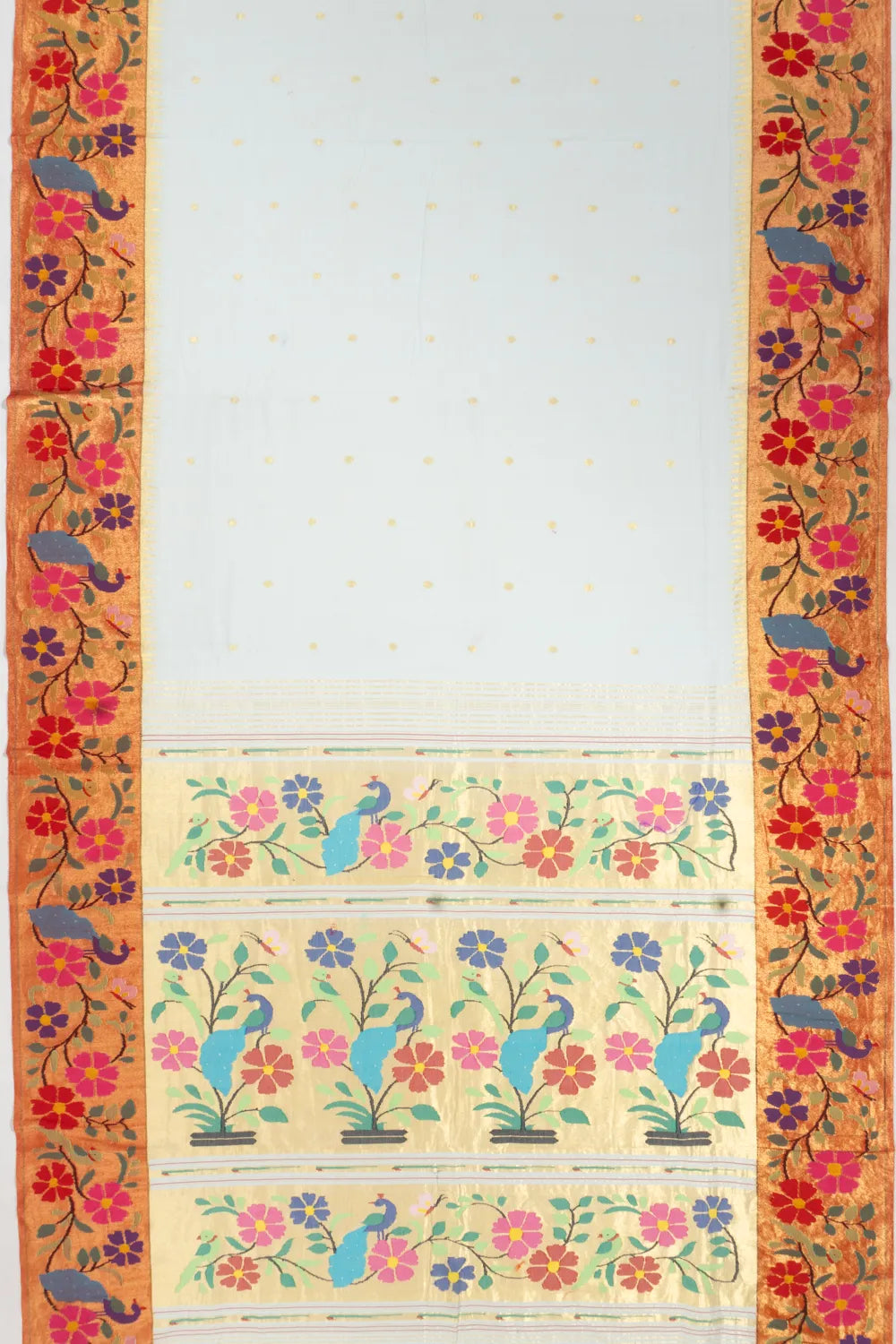 Matching self gold zari tissue pallu embellished with floral vines and peacock motifs, enhancing the saree's regal appeal.