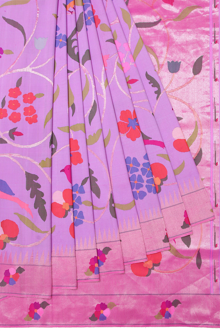 The body features an all-over floral jaal with tapestry weave, showcasing exquisite detailing The self gold zari medium border with florals adds a touch of elegance, while the contrast gold zari tissue Paithani pallu with bird and floral motifs completes the ensemble with finesse Paired with a self plain blouse adorned with zari borders, this saree is a symbol of timeless beauty and cultural heritage