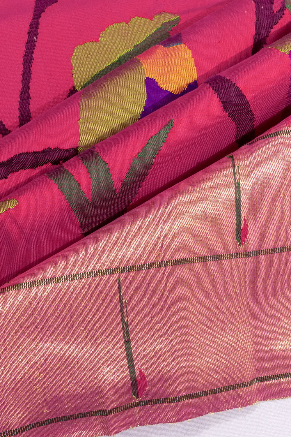 The contrast gold zari tissue double muniya medium border enhances the saree with its traditional appeal, featuring the signature muniya motifs for a distinct, bold look.