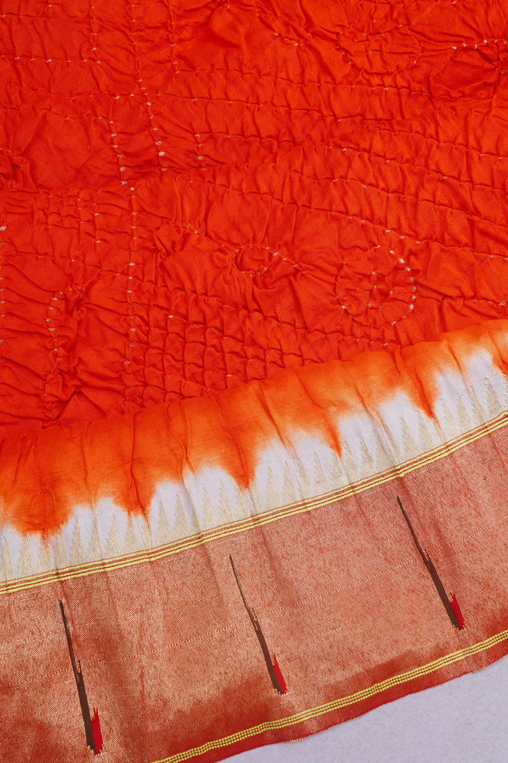 The vibrant orange silk body features traditional Bandhani tie-dye work showcasing lively patterns that reflect cultural artistry and vibrancy.