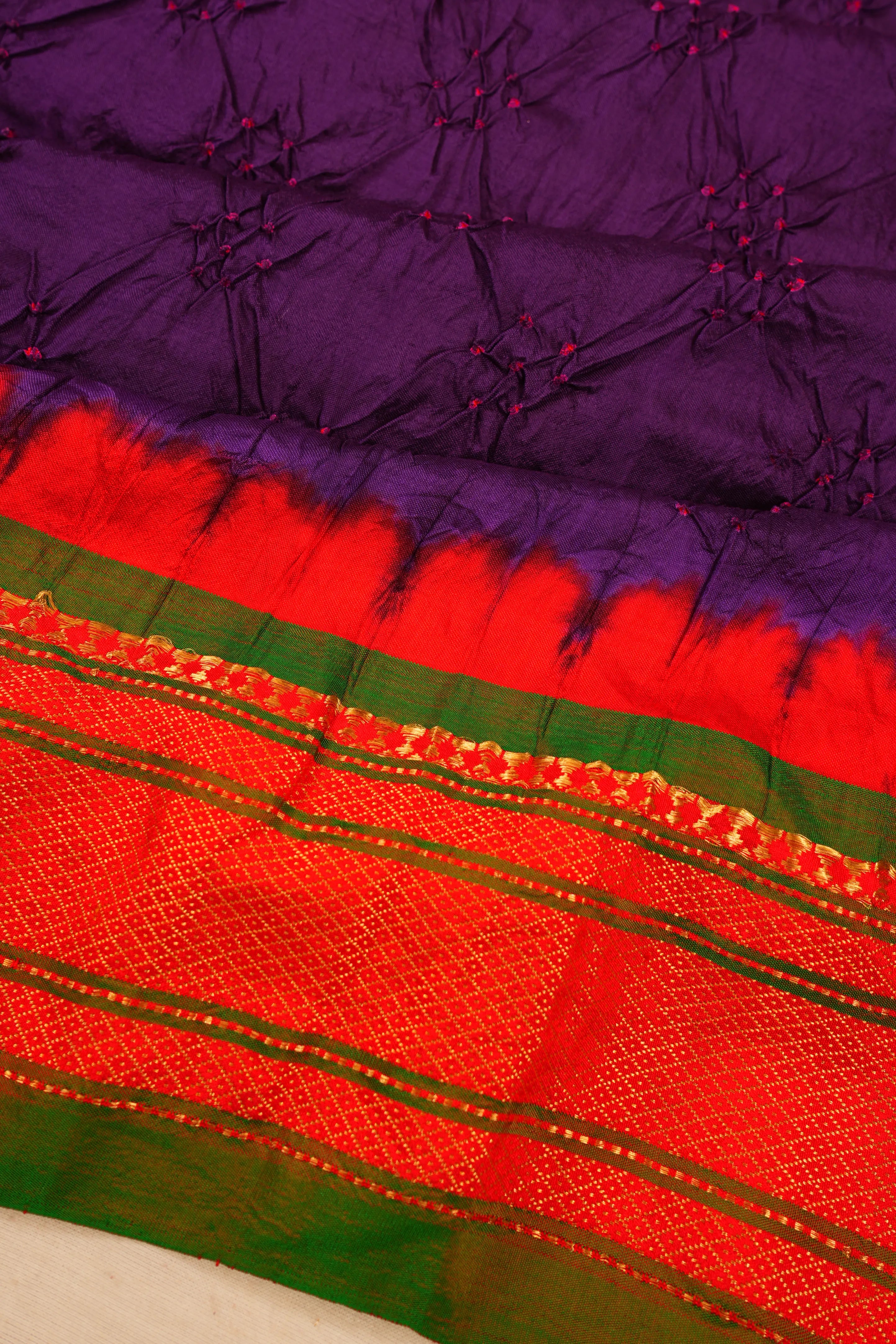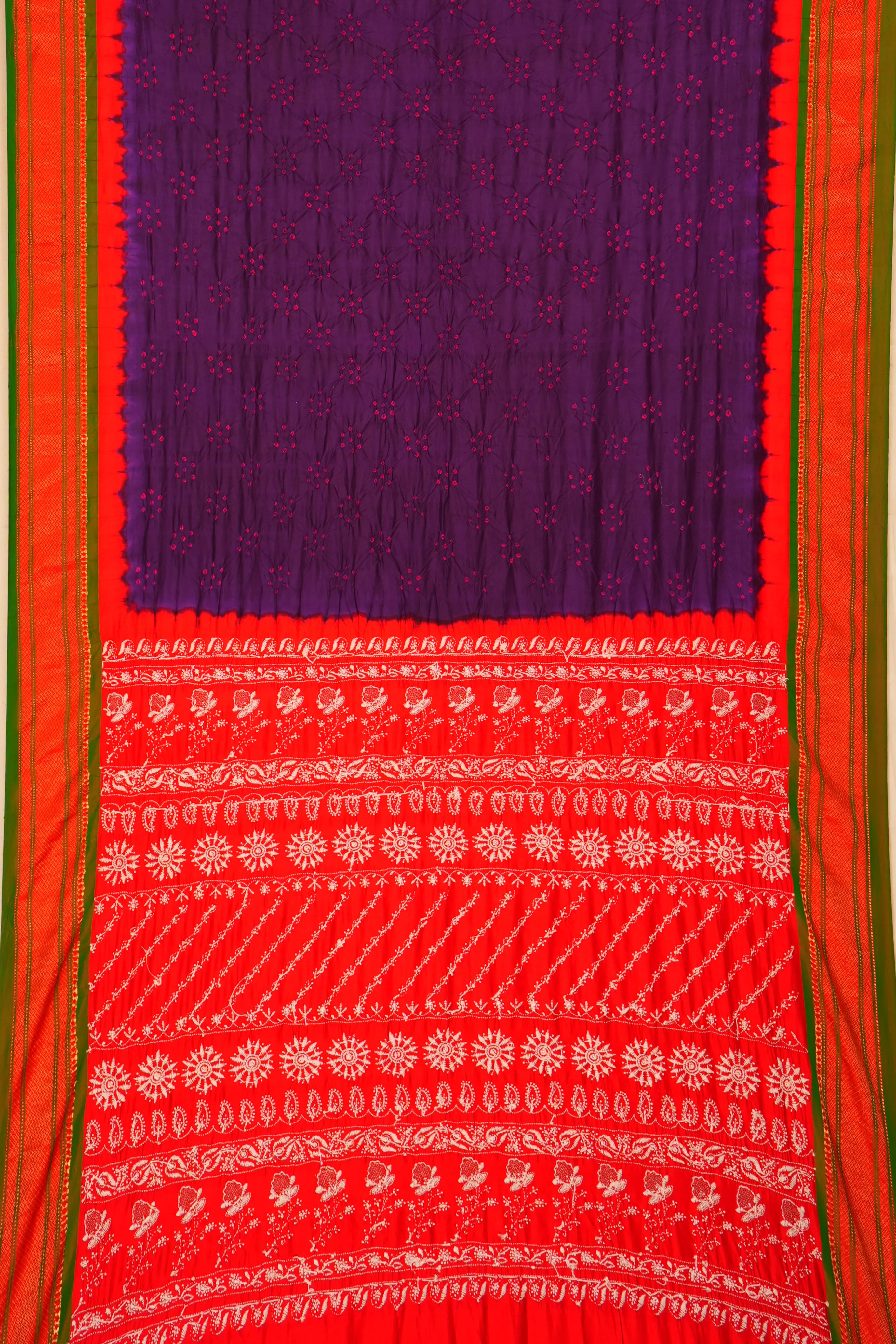 Crafted in traditional bandhani on a majestic purple base, this saree embodies heritage craft with modern flair.